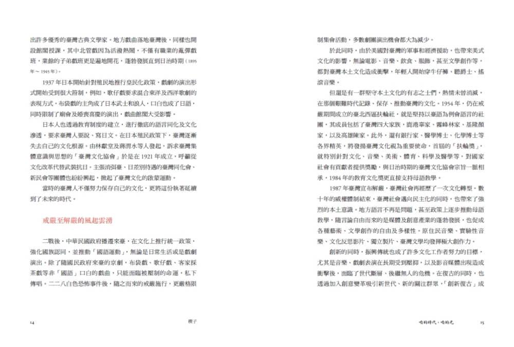 回顧解嚴後的臺灣,隨著外匯解除管制,熱錢湧入、股市指數飆上萬點,在那個臺灣錢淹腳目,全民瘋簽大家樂、瘋飆車的狂飆年代,思想、藝術、文化經過了戒嚴時期的壓抑之後,也迸發出強大能量,既期盼可以找回傳統價值,也積極享受創新的自由。各種地方戲曲不僅恢復野台演出,也進入劇場、國家劇院,藝術價值受到了肯定,布袋戲重返電視螢幕,開創盛極一時的霹靂布袋戲,甚至拍成電影,原住民音樂響徹國際舞台,被聯合國列入無形文化遺產保護的古老雅樂南管、地方民謠,不僅開始有年輕學子願意投入學習,創作方式也注入新意。