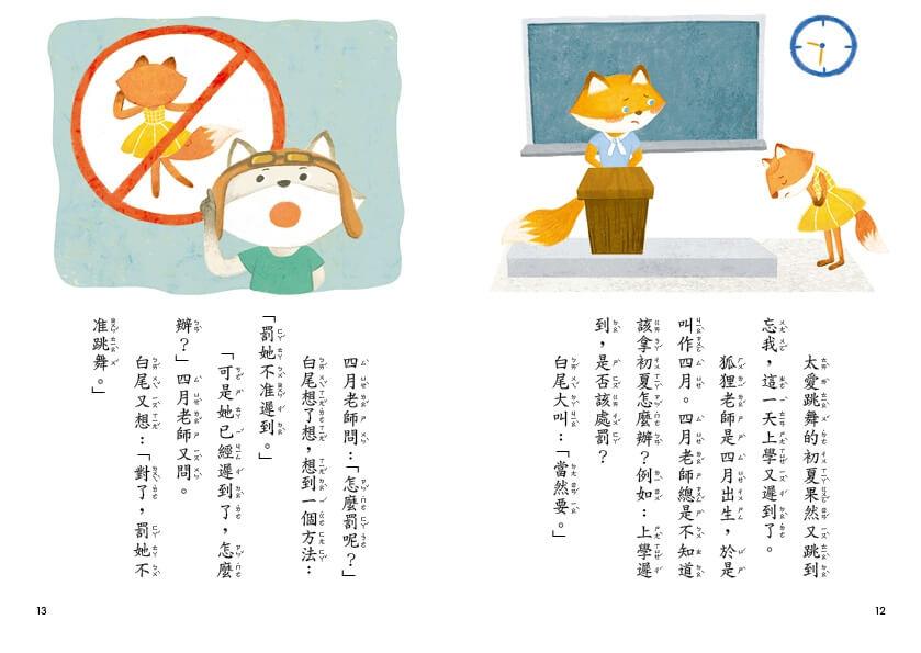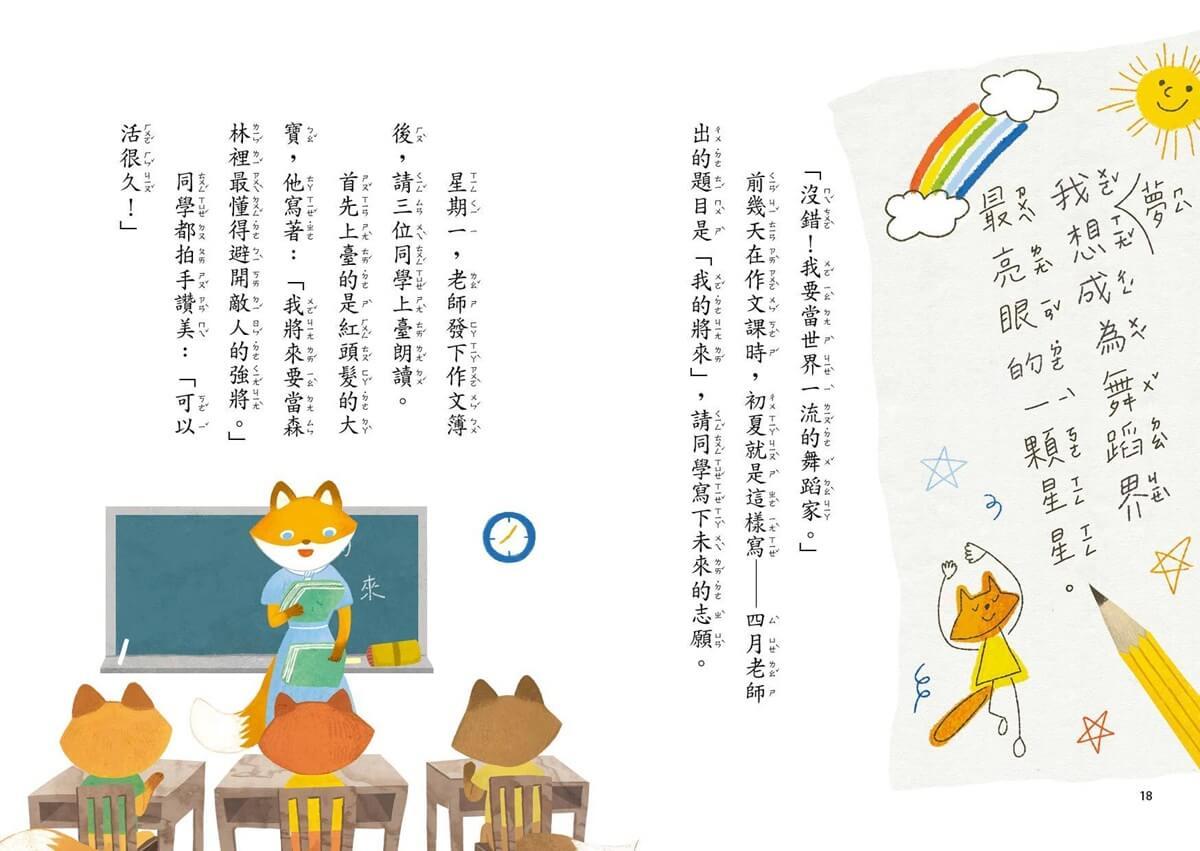 3.精準的圖文配置:每頁的文圖比例近於1:1。暢銷童書作家王淑芬詩意又逗趣的文字,搭上清新淡雅的用色、生動豐富的角色動作,讓孩子能輕鬆無負擔的埋首於閱讀的樂趣中,不知不覺就能讀完一整本書。