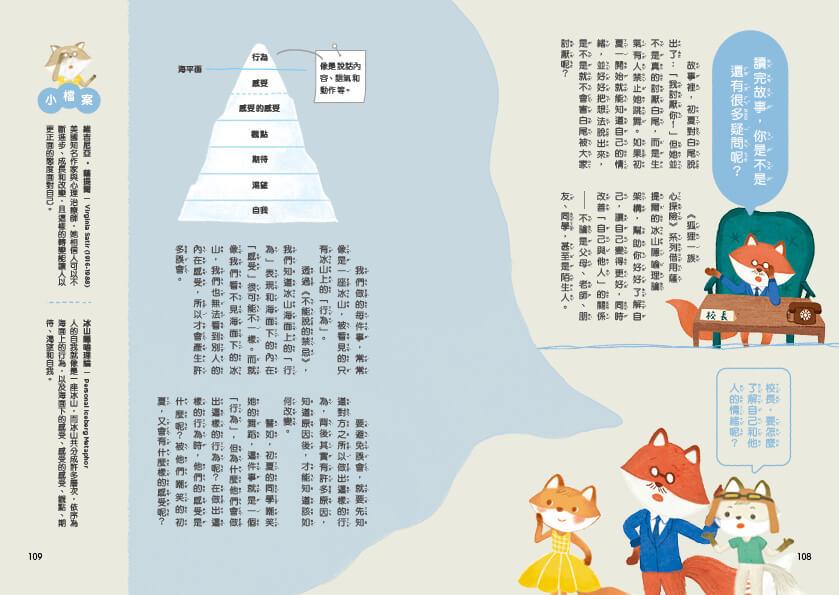 2.小讀者的第一套薩提爾冰山隱喻理論入門讀本:書末附有薩提爾主題附錄,深入淺出地讓讀者理解薩提爾冰山隱喻理論的核心基礎,讓孩童能體察自己的行為和情緒是如何息息相關,不再受情緒主宰。