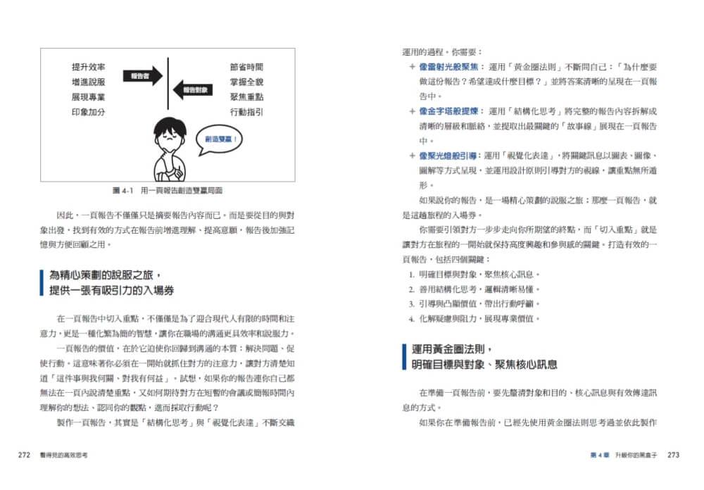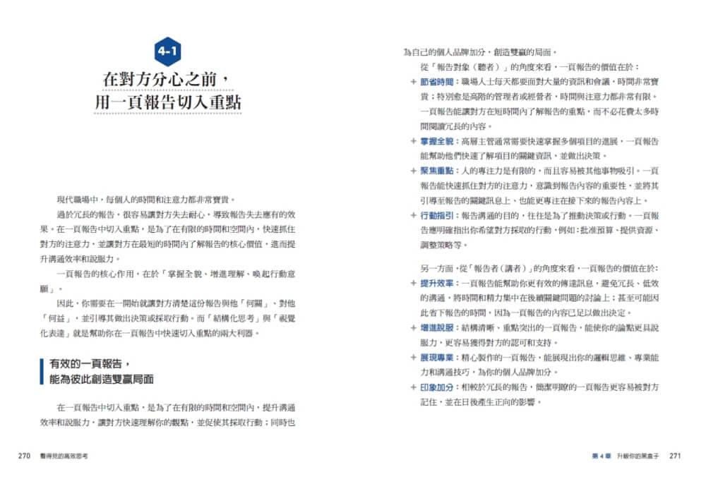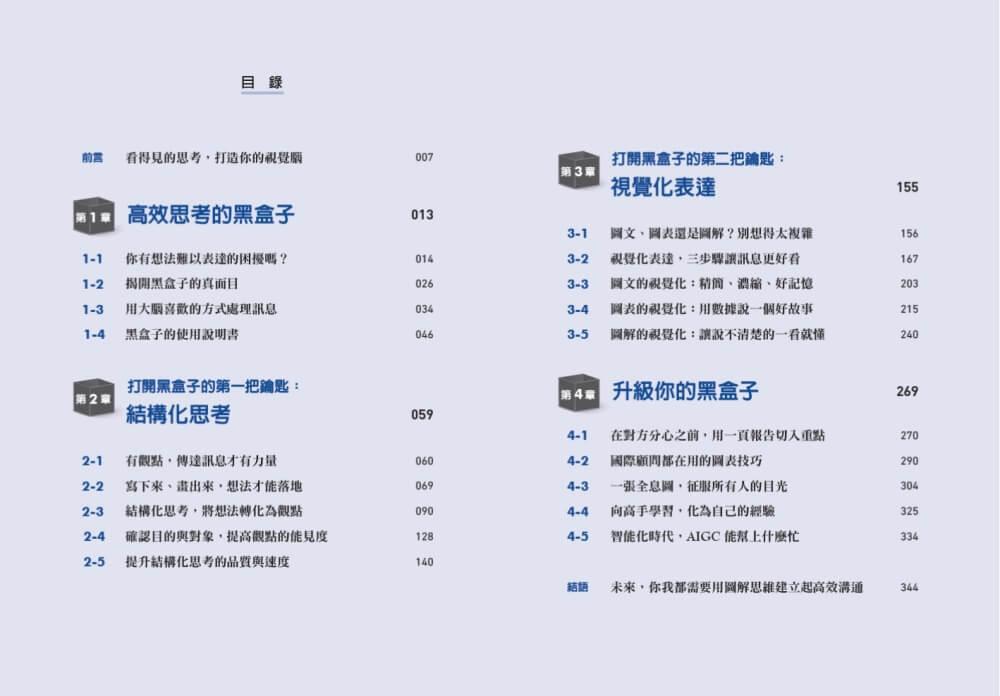 這本書的內容,源於我對結構化思考和視覺化表達的多年探索。在多年實踐中,我發現無論是在職場、學術還是商業及生活中,人們最需要的往往不是更多的訊息,而是更清晰的表達、更高效的理解。
