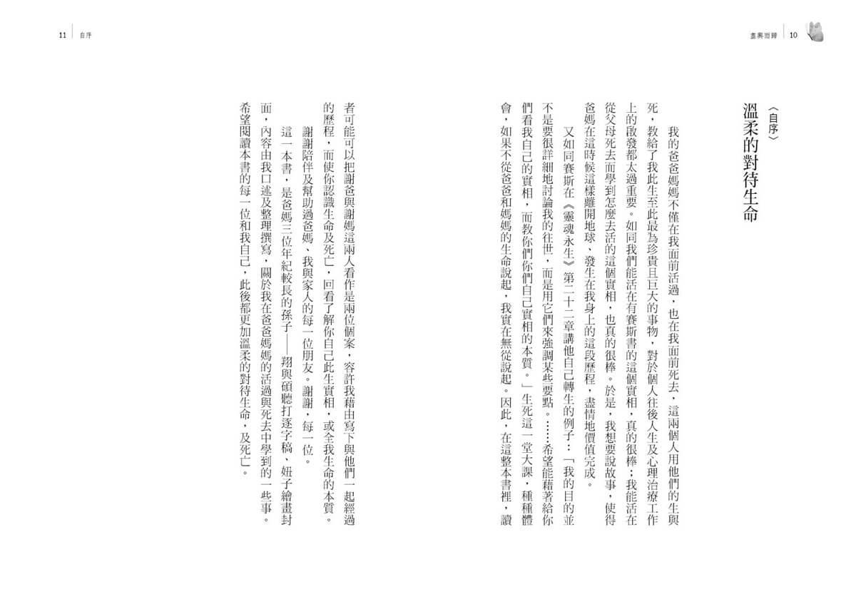這一本書,是爸媽三位年紀較長的孫子——翔與碩聽打逐字稿、妞子繪畫封面,內容由我口述及整理撰寫,關於我在爸爸媽媽的活過與死去中學到的一些事。希望閱讀本書的每一位和我自己,此後都更加溫柔的對待生命,及死亡。