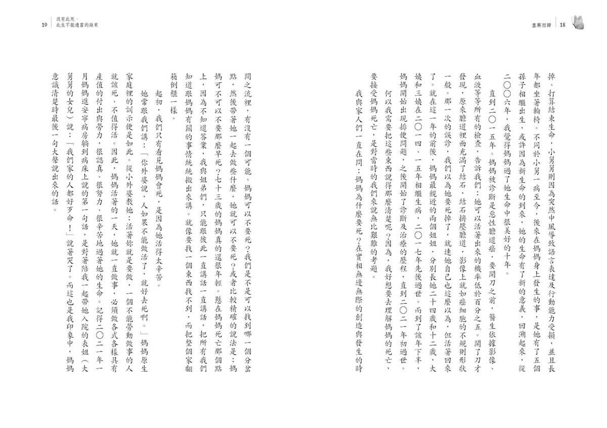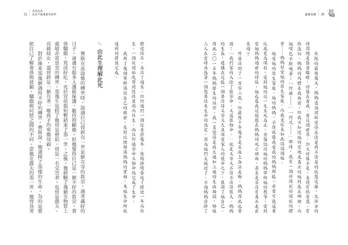 當一個孩子誕生時,人們很少去問:這個人為什麼會生出來。甚至可能也都不曾這樣問過自己:我為什麼被生出來,為什麼來到這個世界。卻在死亡迫在眼前或已經發生的時候,問:他為什麼要死?我為什麼要死?然而,往往這時,人們不要答案,更常的是帶著某一種任性:我不要他死,我要他活回來。人們不想要生命有死亡這件事情發生。我也是這麼開始的。當不了解生命全貌時,其實很難在真正面臨死亡的時間點上,負起責來或有能力去解這道題目。一旦有了足夠大的視野,才能使死亡,有了被理解的角度。