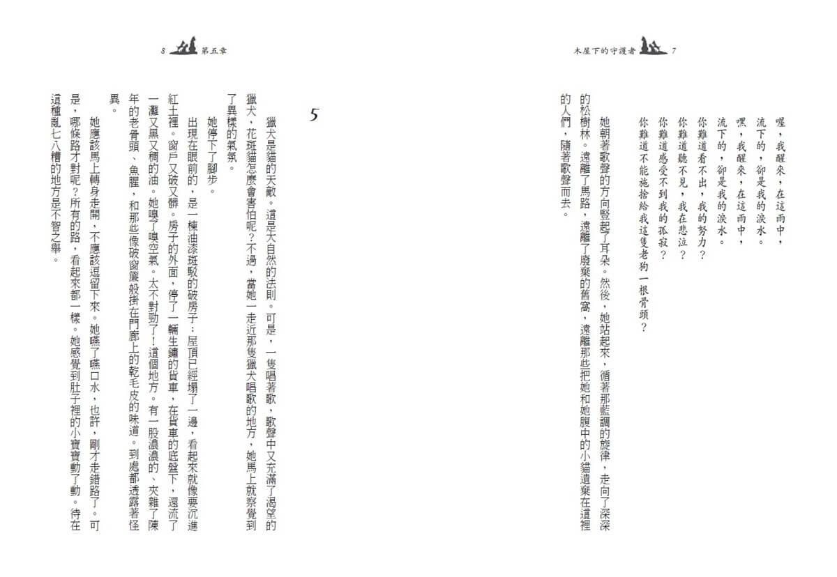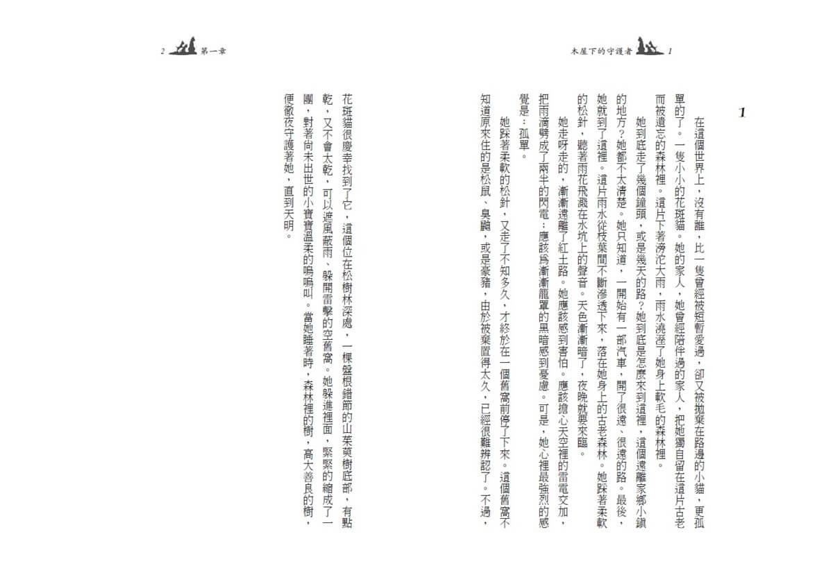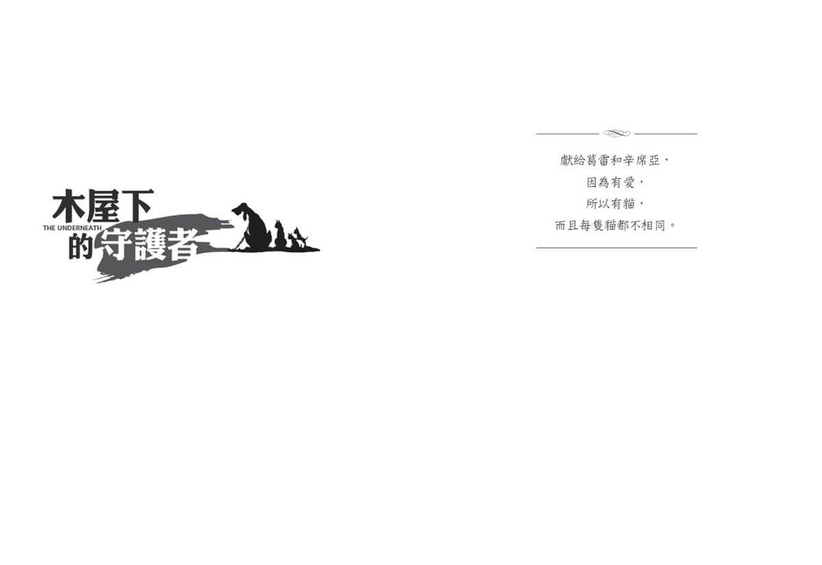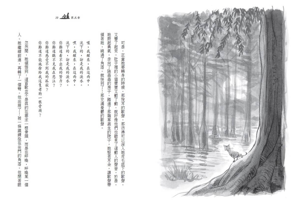 花斑貓不解的看著他。於是,他告訴她有關莎賓河,那條分隔了德克薩斯州和路易斯安那州,一路奔向大海的銀色河流的事。莎賓河。他還記得很久以前,他還是一條小狗的時候,曾經見過它。那是一條很美的河,流動著滿滿的月光。莎賓。這是個好名字。他伸出長舌頭好好的舔了一下他的貓女兒。莎賓。她坐正了起來,試用看看這個名字。滿不錯的!她舔了舔爪子又搔搔耳朵。
