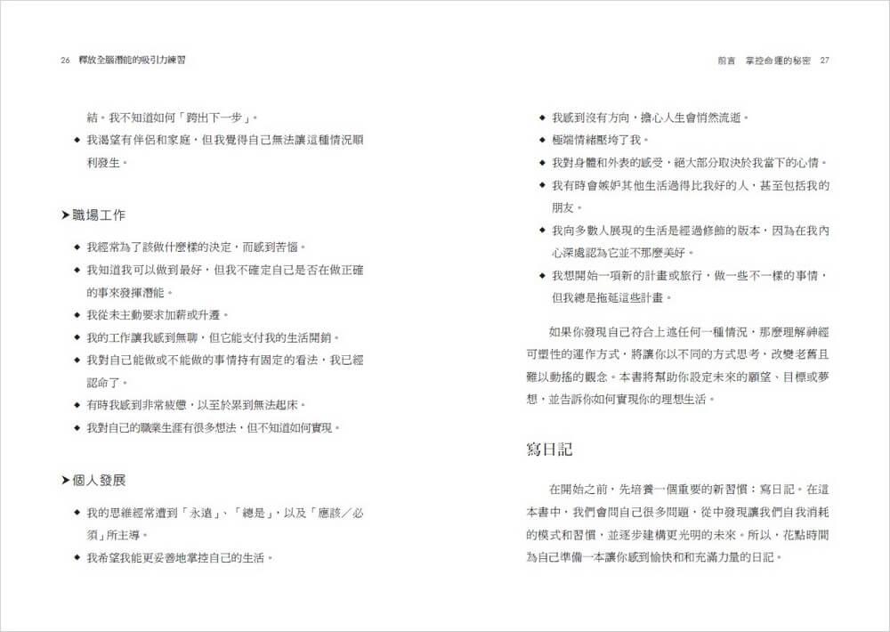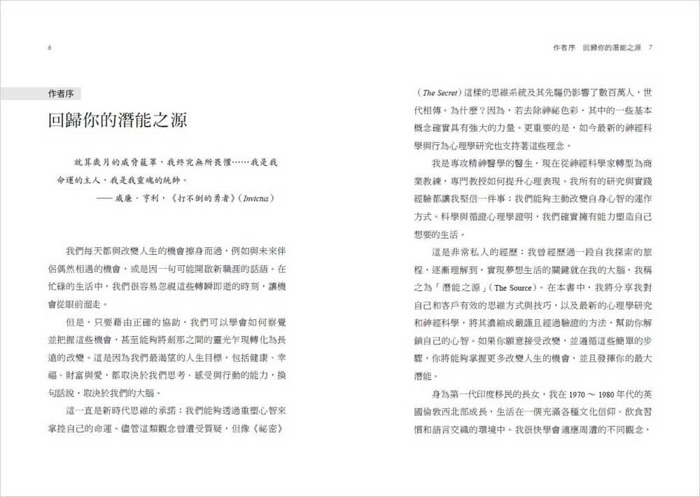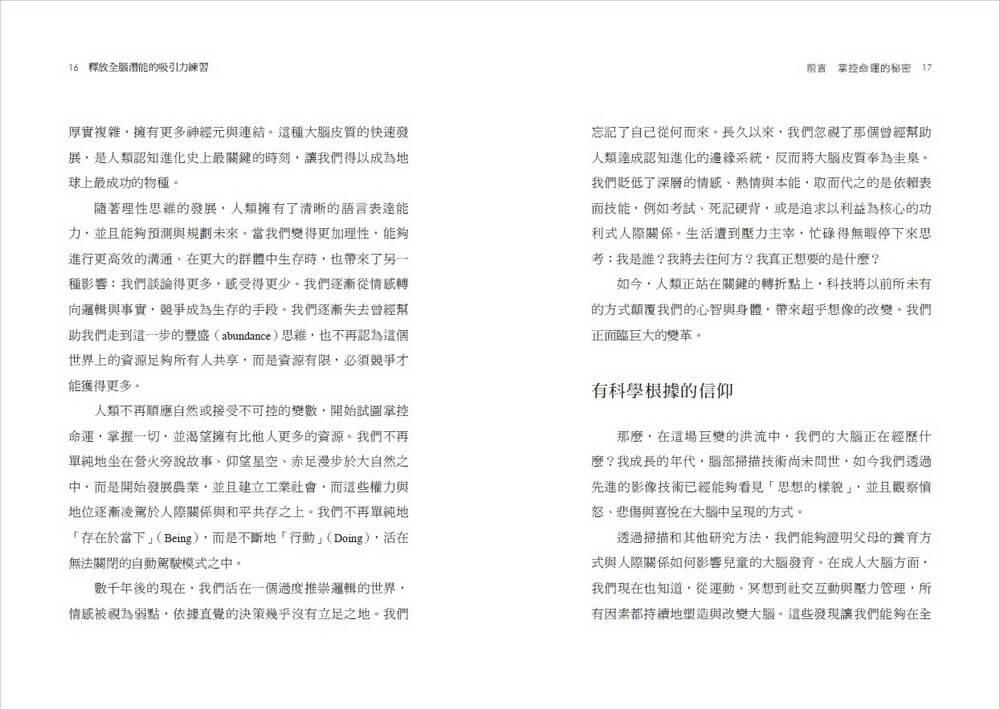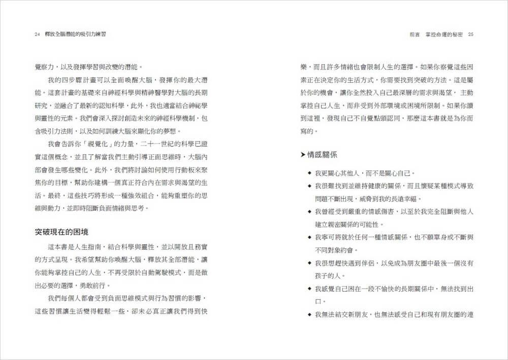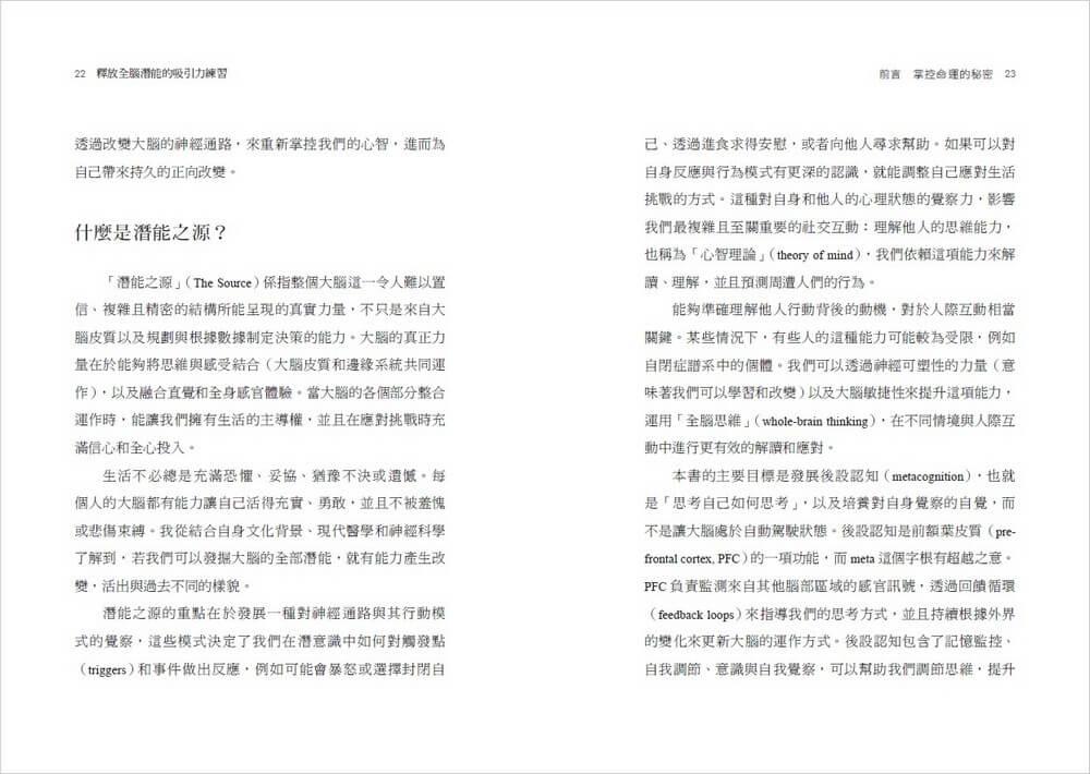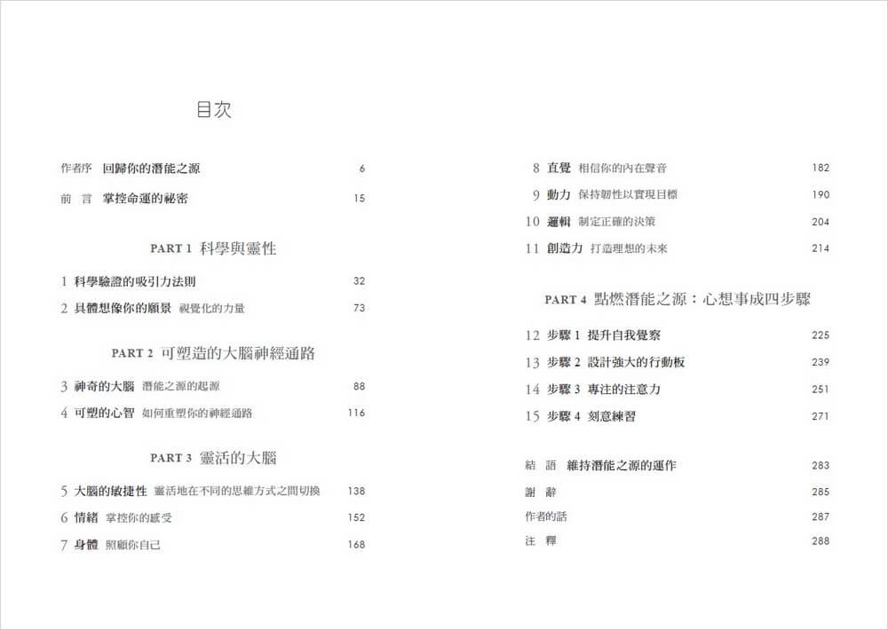 在Part 1中,你將了解吸引力法則和視覺化力量的科學根據。Part 2將探索神經可塑性,以及大腦要如何真正改變其運作方式。Part 3揭示靈活且平衡的大腦如何在我們的生活中發揮重要作用。我鼓勵你嘗試全書的練習,並在最後Part 4提供啟動潛能之源的路線圖。