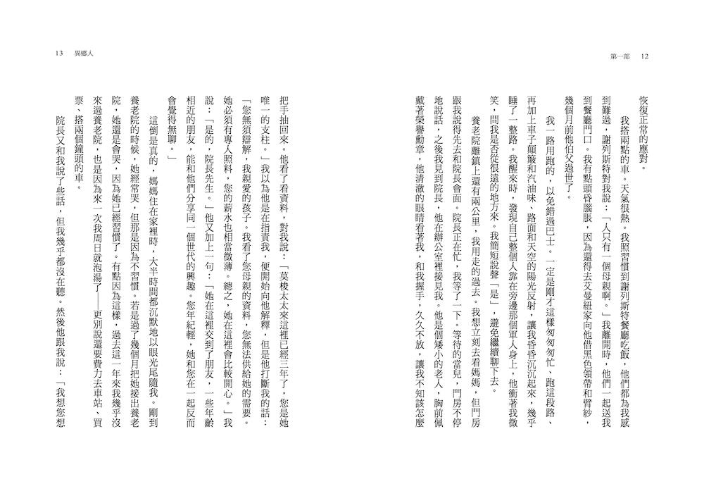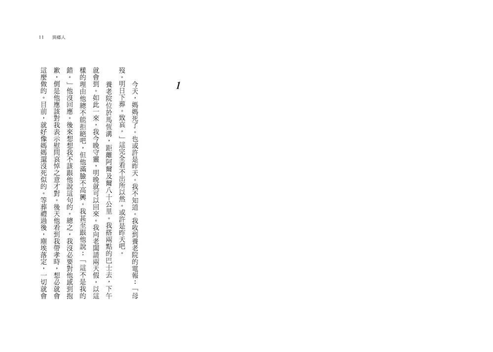 養老院位於馬恆溝,距離阿爾及爾八十公里。我搭兩點的巴士去,下午就會到。如此一來,我今晚守靈,明晚就可以回來。我向老闆請兩天假,以這樣的理由他總不能拒絕吧,但他滿臉不高興。我甚至跟他說:「這不是我的錯。」他沒回應。後來想想我不該跟他說這句的。總之,我沒必要對他感到抱歉,倒是他應該對我表示慰問哀悼之意才對。後天他看到我帶孝時,想必就會這麼做的。目前,就好像媽媽還沒死似的。等葬禮過後,塵埃落定,一切就會恢復正常的應對。