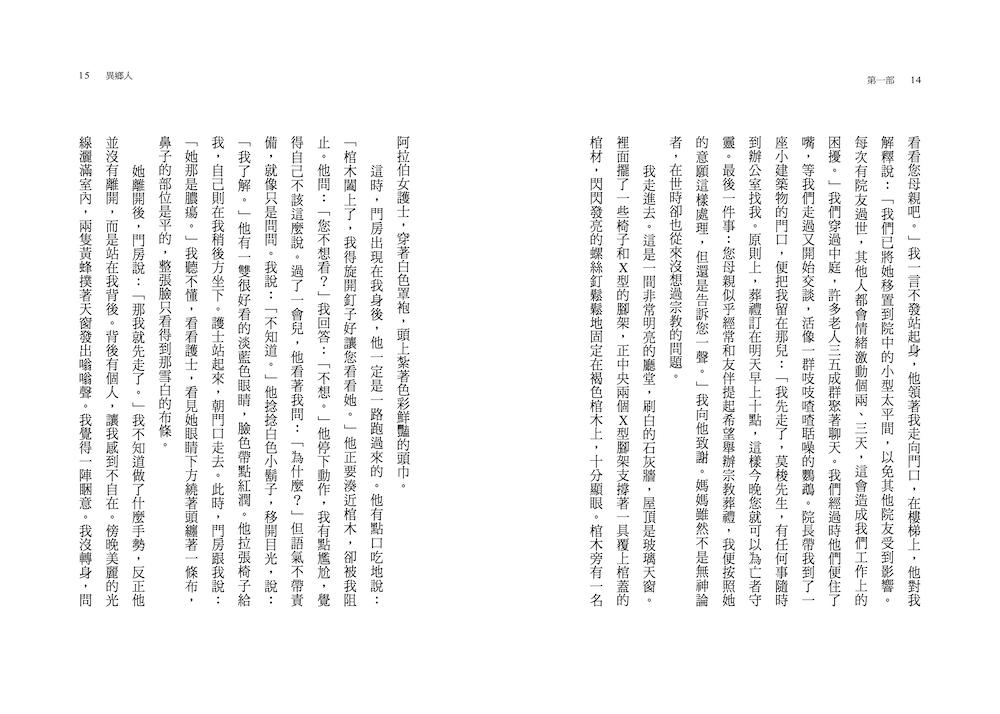 但這時候,我站在中庭一棵梧桐樹下等著,呼吸著新鮮泥土的氣味,已無睡意。我想到辦公室的同事,此時,他們正起床準備上班,對我而言,這向來是最痛苦的時刻。我還在想著這些事,卻被建築物內部的鐘聲打斷。窗戶裡頭一陣忙亂,之後一切又恢復平靜。太陽又升高了一些,陽光開始曬熱我的雙腳。門房穿過中庭,過來跟我說院長要見我。我到院長辦公室去,他要我在一些文件上簽字。我看到他穿著黑衣服和條紋長褲,他拿起電話,問我:「葬儀社的人早已到了,我現在要請他們過來封上棺蓋。在此之前您要看母親最後一眼嗎?」我說不要。他對著話筒低聲吩咐:「費賈克,跟他們說可以開始了。」