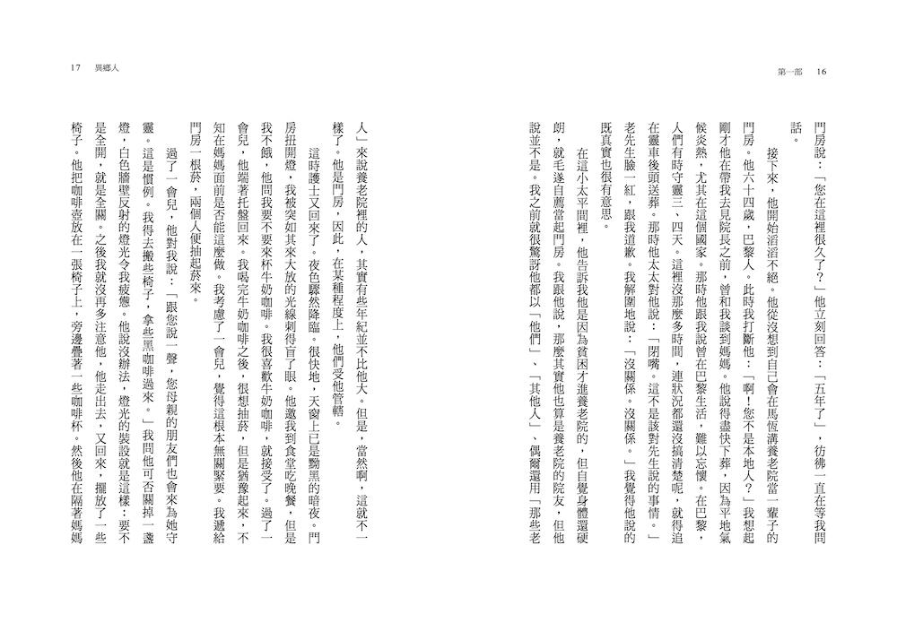 接下來,他開始滔滔不絕。他從沒想到自己會在馬恆溝養老院當一輩子的門房。他六十四歲,巴黎人。此時我打斷他:「啊!您不是本地人?」我想起剛才他在帶我去見院長之前,曾和我談到媽媽。他說得盡快下葬,因為平地氣候炎熱,尤其在這個國家。那時他跟我說曾在巴黎生活,難以忘懷。在巴黎,人們有時守靈三、四天。這裡沒那麼多時間,連狀況都還沒搞清楚呢,就得追在靈車後頭送葬。那時他太太對他說:「閉嘴。這不是該對先生說的事情。」老先生臉一紅,跟我道歉。我解圍地說:「沒關係。沒關係。」我覺得他說的既真實也很有意思。
