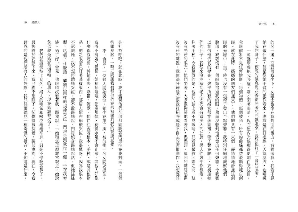 我們就這樣待了良久。婦人的嘆氣和啜泣漸漸平息,只是不停吸著鼻子,最後終於安靜下來。我已經不想睡了,卻覺得很疲倦,腰部痠疼。現在,令我難忍的是他們所有人的靜默。我只偶爾聽見一種奇怪的聲音,不知道是什麼,久了之後,我終於猜出那是其中幾個老人吸著內頰,發出怪異的咂嘴聲。他們如此深陷在思緒之中,並不自覺地發出聲音。我甚至感覺躺在他們中央的死者,在他們眼裡也毫無意義。現在回想起來,我想那是個錯誤的感覺。