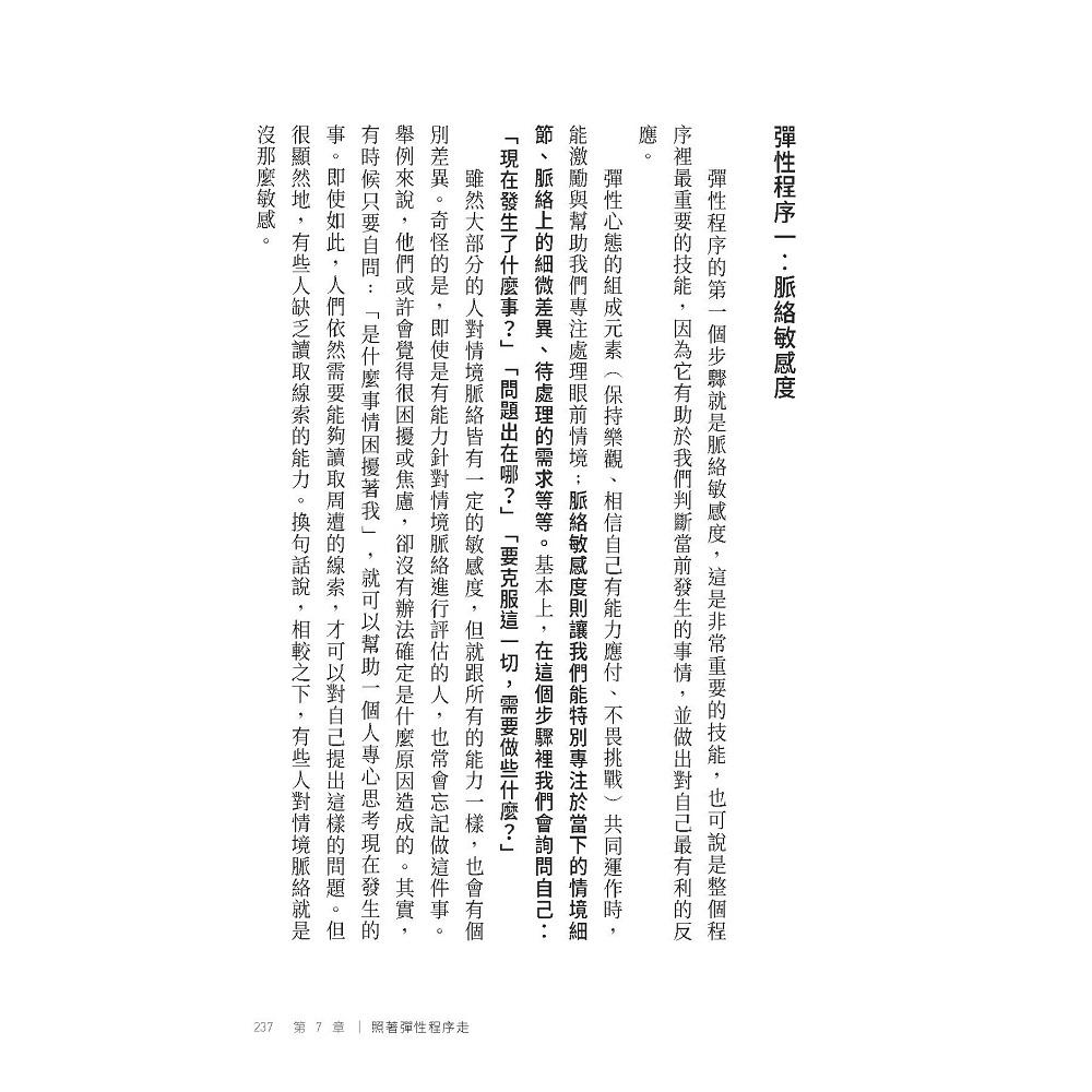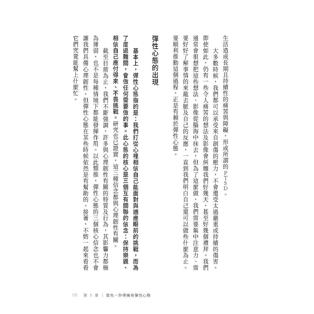 由於在適應逆境時,彈性扮演著極關鍵的角色,因此本書將設法透過大篇幅的說明來拆解和闡述。身為初學者的你,一定要先知道「彈性」並不是一個被動的過程。潛在創傷事件令人痛苦與不安,讓我們只想抹滅它們的存在。因此,要適應創傷事件需要主動積極且系統性地去思考:「我們到底經歷了什麼?事情為什麼會如此變化?」為了有效達成目標,需要滿懷動力並實際參與、需要擁有我所謂的「彈性心態」(flexibility mindset)。