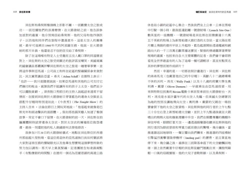 然而,幸運的是,一切都依照計畫進行。貝佐斯、貝佐斯的弟弟馬克(也戴著他自己的牛仔帽)、高齡八十二歲總喋喋不休的沃利.馮克(Wally Funk)以及十八歲的荷蘭大學生奧利佛.戴蒙(Oliver Daemen)一早就乘坐由亞馬遜投資、用來與特斯拉(Tesla)抗衡的Rivian電動卡車原型車前往火箭發射臺。沃利.馮克是水星計畫年代的太空人先驅,但美國太空總署因為她的性別沒讓她飛向太空;奧利佛.戴蒙的父親在一場拍賣會買下他的太空之旅資格。貝佐斯與他的同行者於上午七點三十分左右登上新雪帕德太空艙,並於上午九點過後就在火箭噴出的熊熊火焰和廢氣煙霧中升空。我們在媒體專屬的機棚外屏住呼吸,眼睛盯著天空,一邊透過揚聲器收聽貝佐斯與他的同行者因為眼前景致和零重力感而發出的驚嘆。幾分鐘後,當推進器返回地球時,一聲巨響向我們襲來。推進器的四座噴射引擎猛烈衝擊著陸停機坪(landing pad)的瀝青,並且筆直地停下來。幾分鐘之後,垂掛在三面降落傘底下的太空艙飄回地球,頭上依然戴著牛仔帽的貝佐斯從艙門裡衝出來,擁抱明顯鬆一口氣的母親賈姬、他的大兒子普勒斯頓,以及桑契斯。