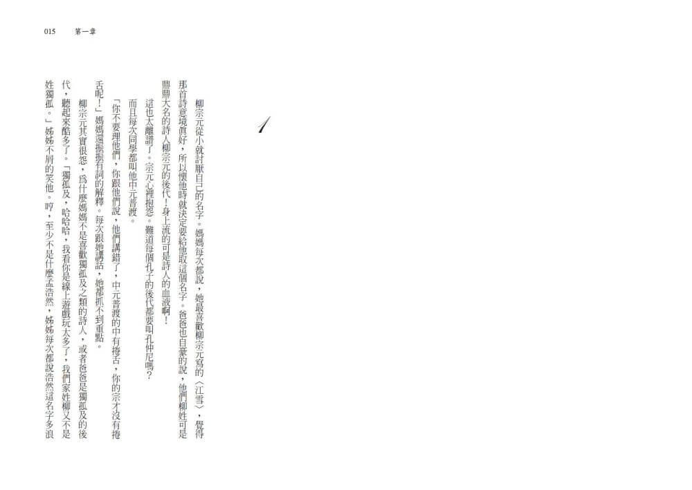 他其實很怨,為什麼媽媽那時候不是喜歡獨孤及之類的詩人,或者爸爸是獨孤及的後代, 聽起來酷多了。「獨孤及,哈哈哈,我看你是線上遊戲玩太多了,我們家姓柳又不是姓獨孤。」姊姊不屑的笑他。哼,至少不是什麼孟浩然,姊姊每次都說浩然這名字浪漫多了,很像帥哥的名字,柳宗元覺得噁心死了,還是獨孤及比較有水準。