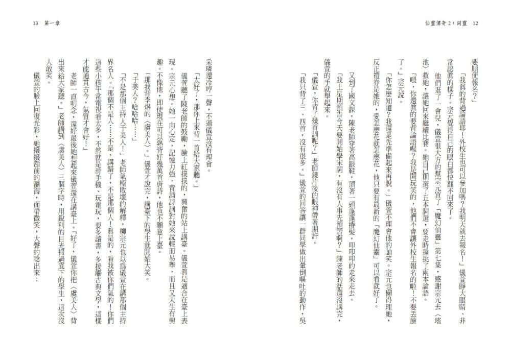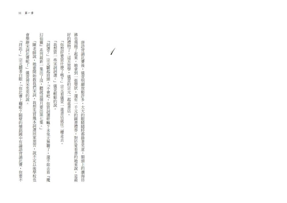 「是啊。我又不是你。」宗元嘆口氣。儀萱從小學高年級開始跟他同班,功課不算好,數學老是算錯,自然老是搞不懂,社會老是記不起來,作文老是寫不順……不過她對唐詩背誦有特別的天賦,每一首新學的唐詩都可以快速的朗朗上口。學校每年都會舉辦唐詩背誦比賽,儀萱已經拿了兩年第一名了。