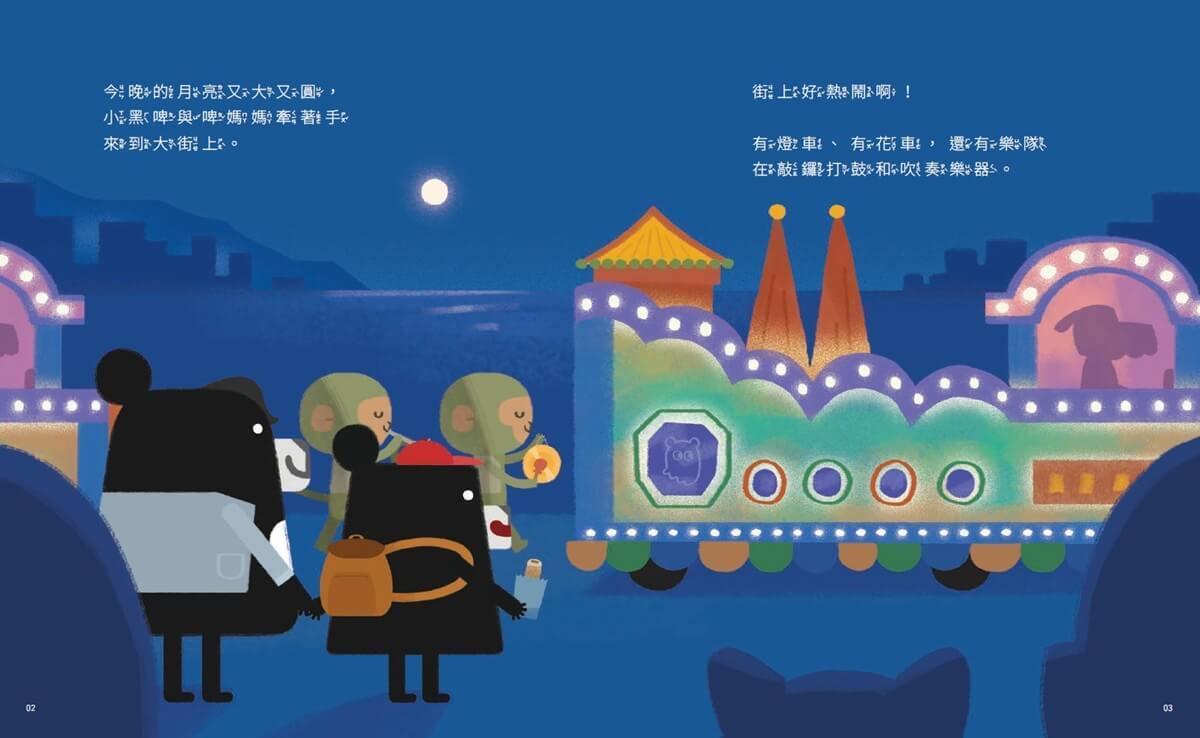 今晚的月亮又大又圓,小黑啤與啤媽媽牽著手來到大街上。