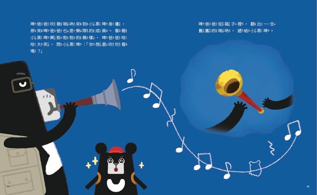 啤爸爸吹著嗩吶來到小黑啤身邊,原來啤爸爸也是樂隊的成員。看著小黑啤興致勃勃的模樣,啤爸爸哈哈大笑,問小黑啤:「你想要吹吹看嗎?」
