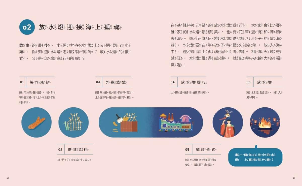讓我們來認識基隆,發現當地的歷史和基隆中元祭的起源。從燈火輝映的放水燈儀式,來了解水燈的製作和儀式進行。另外,一起環遊世界,認識各種與亡靈相關的節日和儀式,體驗各地的人們如何以不同方式向過往致敬。最後,跟著小黑啤學習整理情感,回顧與親友共度的點滴時光,學會好好說再見。