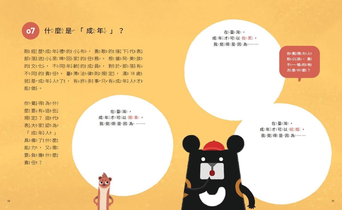 在文化面上,介紹包含豐年祭、成年禮在內的阿美族文化,以及臺灣多元的原住民族群;在素養面上,帶領學童認識「成年」和「身體自主權」概念。思考長大所帶來的責任,也了解遭遇騷擾時正確的處理方式。