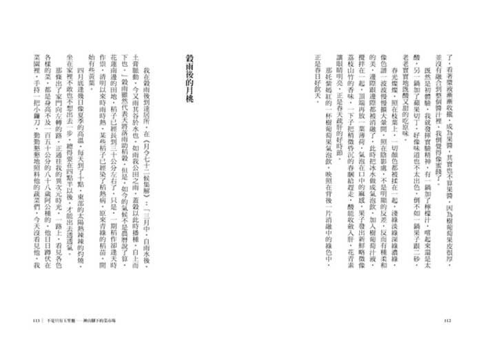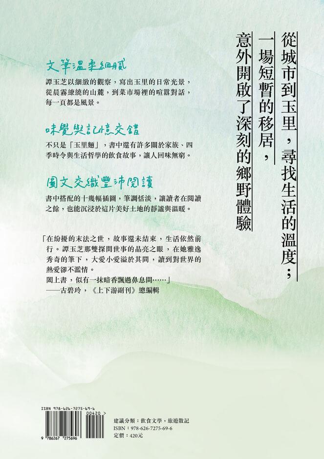 本書融合環境文學、飲食文化與生活日常,譚玉芝的文字猶似電影之跳接,柳岸花明又一村。才寫著玉里,忽爾轉到日本或上海,卻又嚴絲合縫,完全無違和感,簡直是神來之筆。