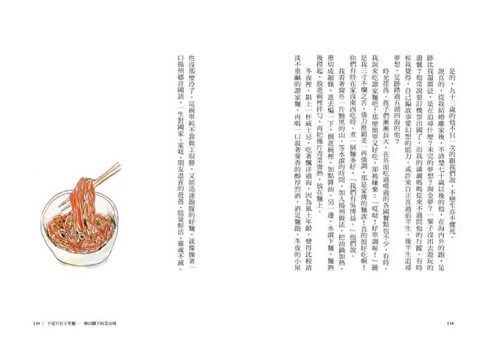 飲食在本書裡佔有一定比例,確實如玉芝所寫的:「飲食,就是一個人的生命史,且以個人的書寫,拉開一扇窗,那裡有自己的山景。」她從一碗單純不靠做工取勝,又能迅速飽腹的玉里麵,回溯及她那操著揚州鄉音的父親所傳的﹁譚家麵﹂;一鍋道地與否的獅子頭,入口驚動的不僅是味覺,而像似一生對國家家庭朋友盡責的父親,其精神永遠停留在那碗滋味鮮活毫不花俏的麵和丸裡。在她筆下,食物更像破解配合題般,一入口就連到每個人盤根錯節的心事和理還亂的關係,熱熱送進嘴裡,引出滿眼辣辣的串珠。