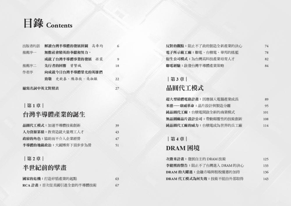 歸根究柢,台灣半導體產業的成功,一則投入的時間夠早,再者得益於全球化帶來貿易自由化的時機,可以與全球的客戶夥伴合作成長,另外來自本身技術的累積和突破。這是台灣工程師們窮五十年的歲月,孜孜矻矻、宵衣旰食,共同創造的成果。五十年專心致志,鍥而不捨,才能積土成山、積水成淵。五十年的歲月,至少跨越兩個世代的工程師,包括產業草創時期的孫運璿、李國鼎、潘文淵、方賢齊等先知,他們若在世,現在是逾百歲之齡;包括第一代的產官學研各界領導人,如:施敏、胡定華,有些已經身退,有些仍持續打拼中;也包括第二代領導人,現在是六十歲上下。這些領導人多數是工程師出身,他們帶領其他工程師,一起創造了台灣半導體的傳奇。這本書除了記錄下他們奮鬥的歷史,也是向他們致敬。