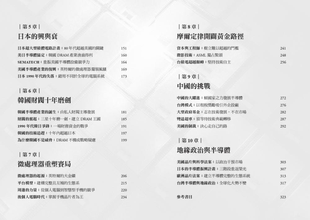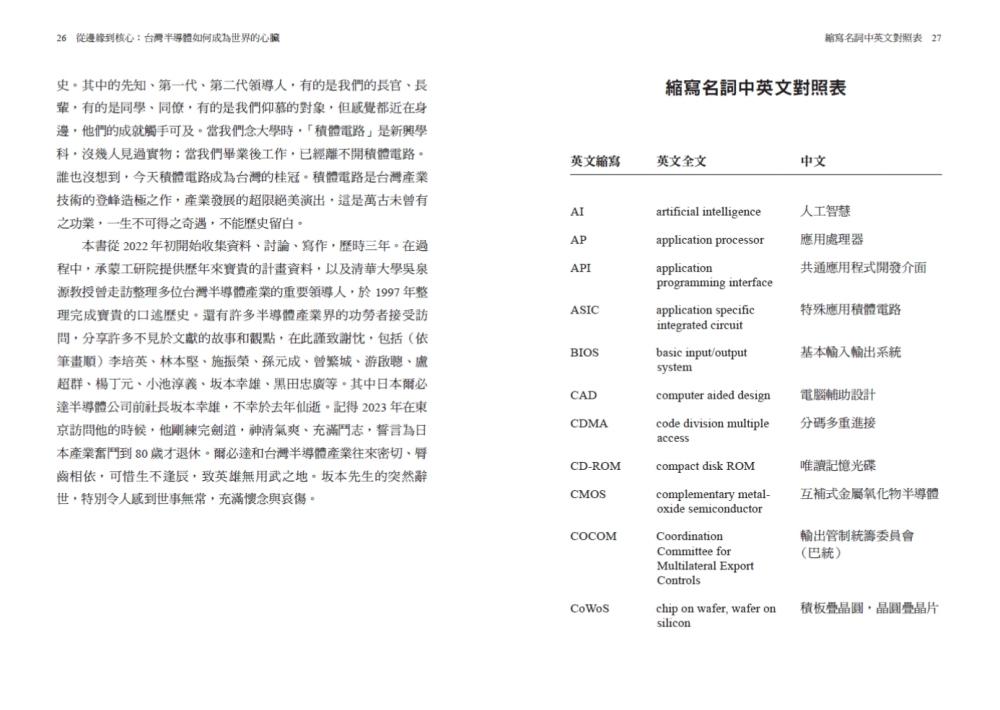 本書從2022年初開始收集資料、討論、寫作,歷時三年。在過程中,承蒙工研院提供歷年來寶貴的計畫資料,以及清華大學吳泉源教授曾走訪整理多位台灣半導體產業的重要領導人,於 1997年整理完成寶貴的口述歷史。還有許多半導體產業界的功勞者接受訪問,分享許多不見於文獻的故事和觀點,在此謹致謝忱,包括(依筆畫順)李培英、林本堅、施振榮、孫元成、曾繁城、游啟聰、盧超群、楊丁元、小池淳義、坂本幸雄、黑田忠廣等。其中日本爾必達半導體公司前社長坂本幸雄,不幸於去年仙逝。記得2023年在東京訪問他的時候,他剛練完劍道,神清氣爽、充滿鬥志,誓言為日本產業奮鬥到80歲才退休。爾必達和台灣半導體產業往來密切、脣齒相依,可惜生不逢辰,致英雄無用武之地。坂本先生的突然辭世,特別令人感到世事無常,懷念與哀傷。