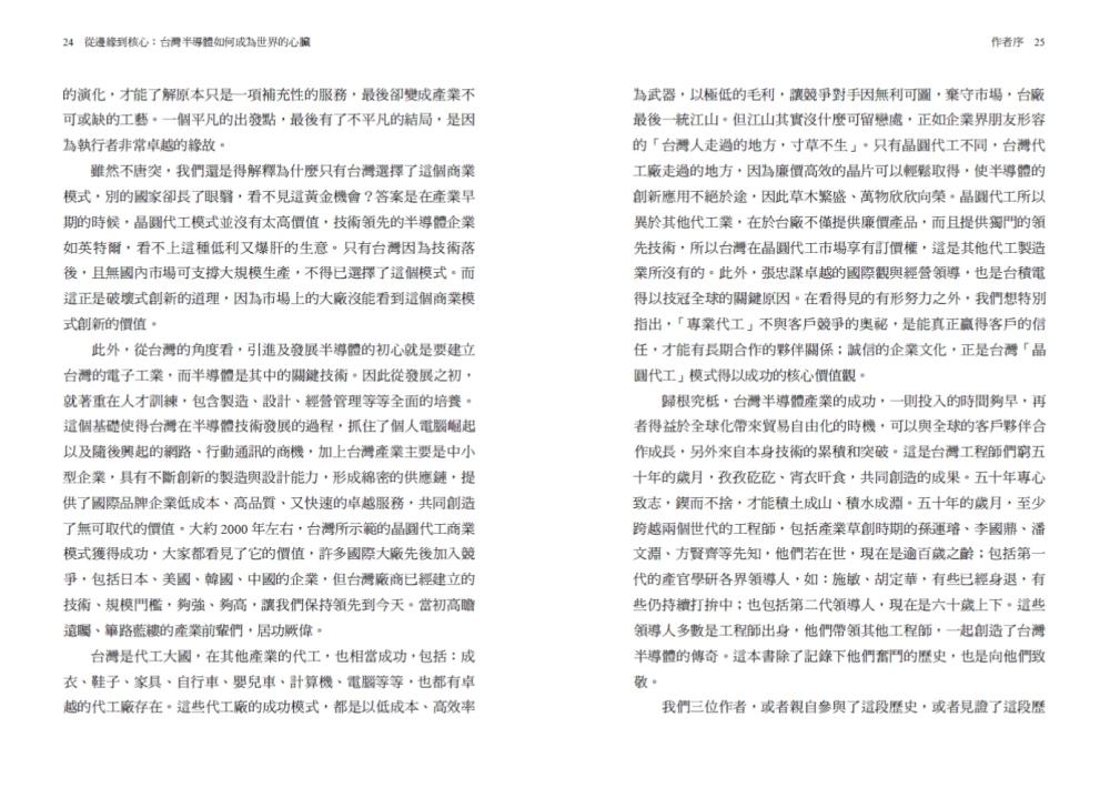 我們三位作者,或者親自參與了這段歷史,或者見證了這段歷史。其中的先知、第一代、第二代領導人,有的是我們的長官、長輩,有的是同學、同僚,有的是我們仰慕的對象,但感覺都近在身邊,他們的成就觸手可及。當我們念大學時,「積體電路」是新興學科,沒幾人見過實物;當我們畢業後工作,已經離不開積體電路。誰也沒想到,今天積體電路成為台灣的桂冠。積體電路是台灣產業技術的登峰造極之作,產業發展的超限絕美演出,這是萬古未曾有之功業,一生不可得之奇遇,不能歷史留白。