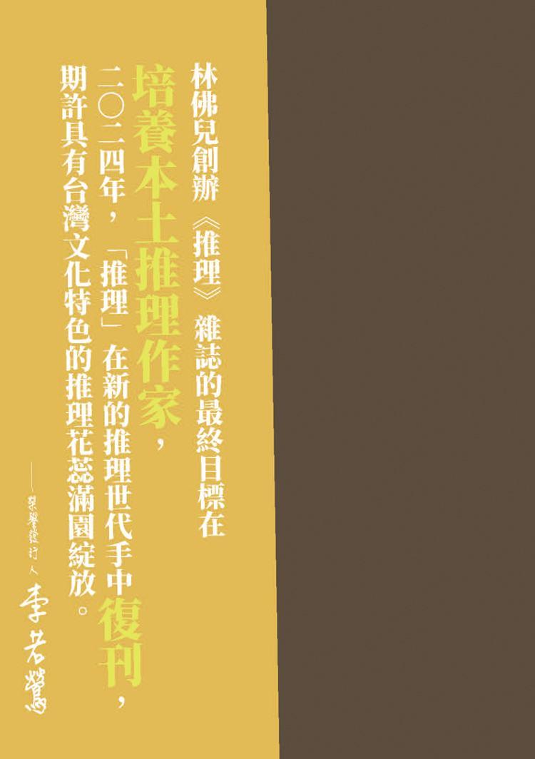 《推理》雜誌長期作為本土作家發表創作的重要園地,在漫長的空白後,如何通過新世代的視角與對類型文學更寬廣的定義、詮釋,接續起犯罪推理在台灣的本土化發展?2025年重返每月一期發行!令人引頸期待!