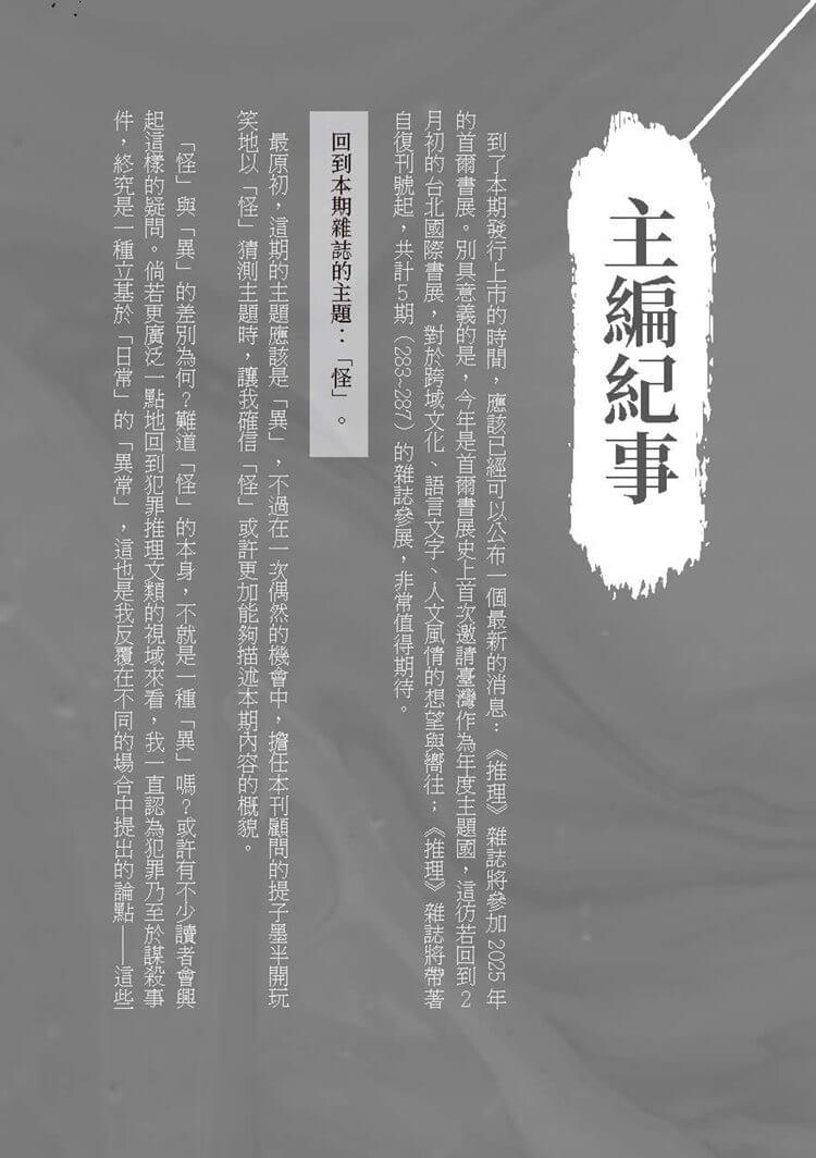 到了本期發行上市的時間,應該已經可以公布一個最新的消息:《推理》雜誌將參加2025 年的首爾書展。別具意義的是,今年是首爾書展史上首次邀請臺灣作為年度主題國,這彷若回到2月初的台北國際書展,對於跨域文化、語言文字、人文風情的想望與嚮往;《推理》雜誌將帶著自復刊號起,共計5期(283~287)的雜誌參展,非常值得期待。