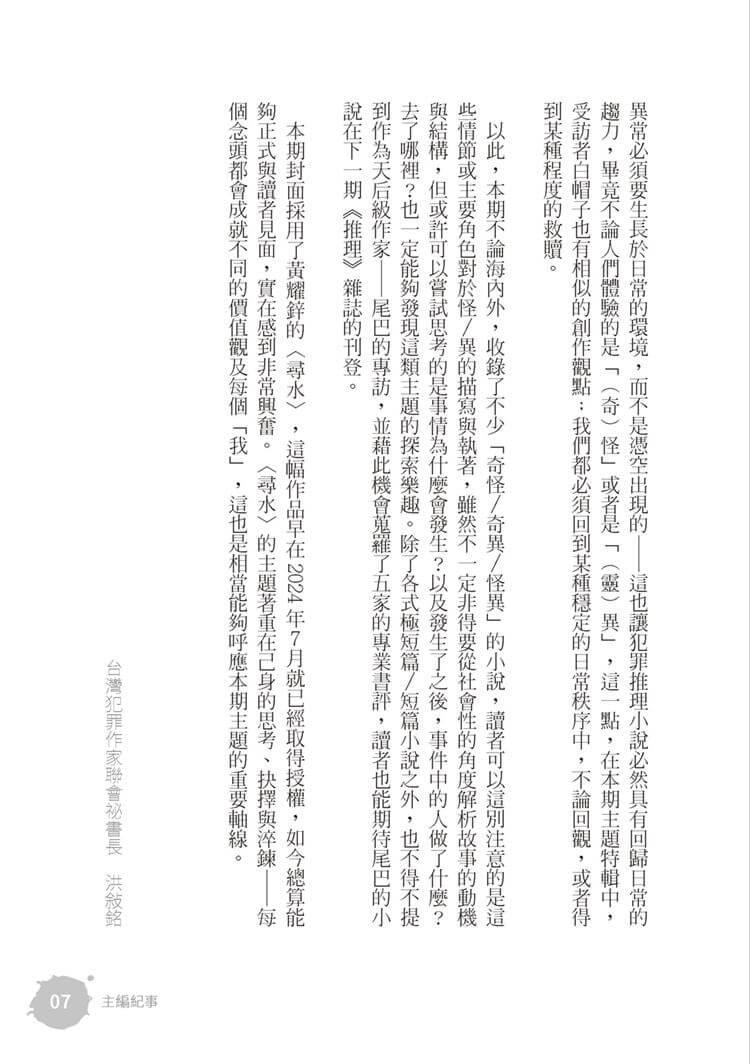 以此,本期不論海內外,收錄了不少「奇怪/奇異/怪異」的小說,讀者可以這別注意的是這些情節或主要角色對於怪/異的描寫與執著,雖然不一定非得要從社會性的角度解析故事的動機與結構,但或許可以嘗試思考的是事情為什麼會發生?以及發生了之後,事件中的人做了什麼?去了哪裡?也一定能夠發現這類主題的探索樂趣。除了各式極短篇/短篇小說之外,也不得不提到作為天后級作家――尾巴的專訪,以及蒐羅了五家的專業書評,讀者也能期待尾巴的小說在下一期《推理》雜誌的刊登。