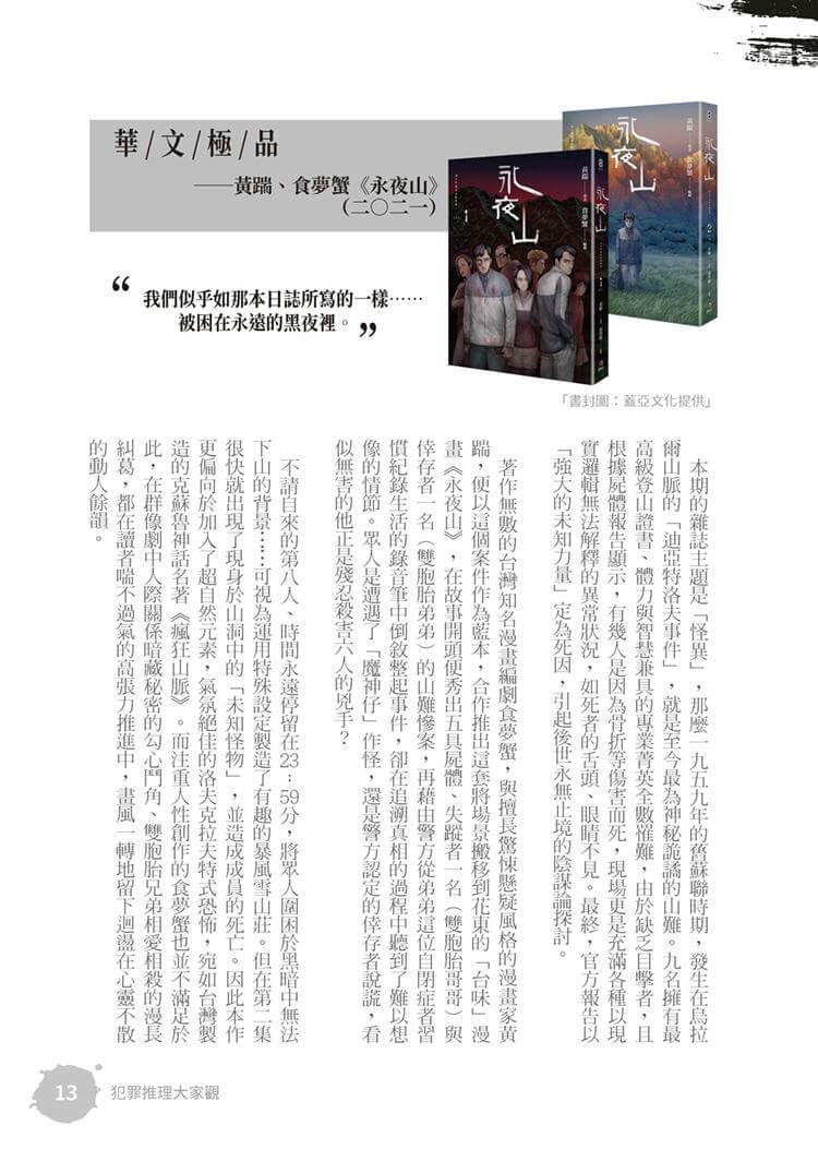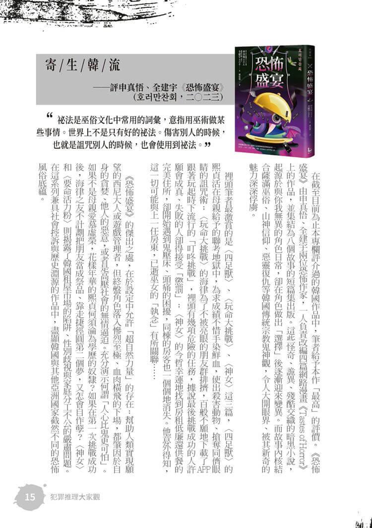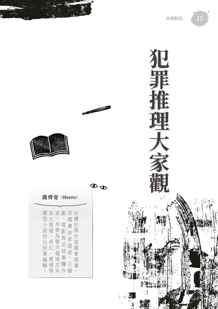 特別收錄田羽心的小說評介,介紹一起充滿奇怪的命案;致敬「推理小說大家看」的「犯罪推理大家觀」持續刊載對華文、日本、韓國的犯罪創作小說評介,犯罪小說迷絕對不容錯過。