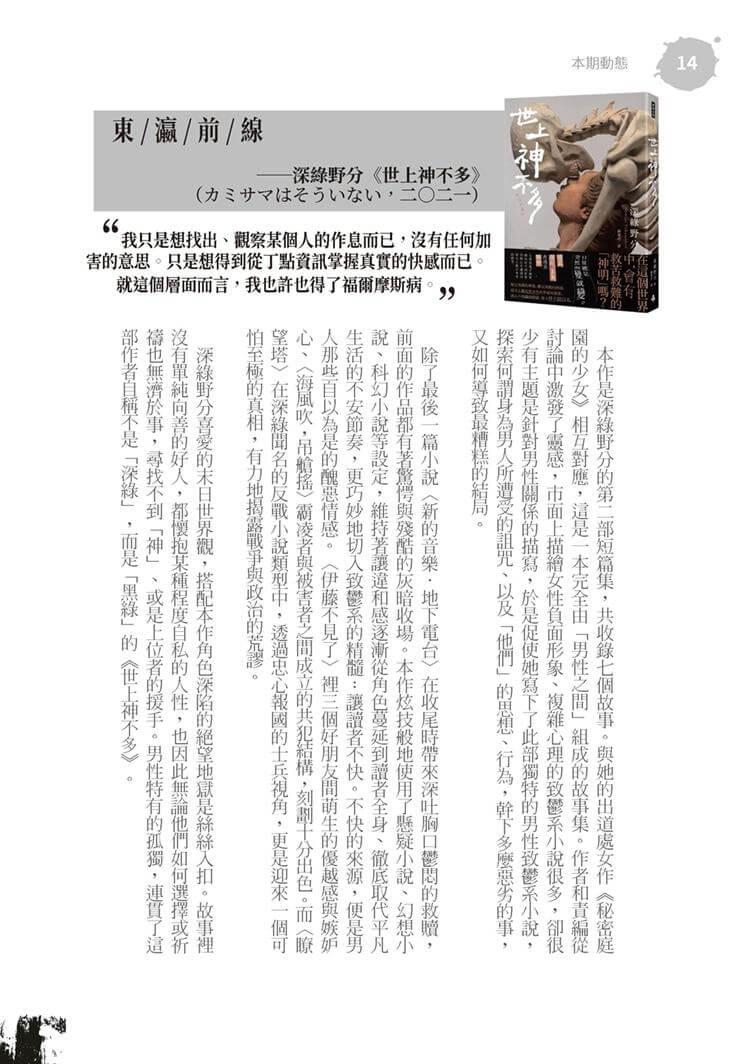 持續開創本土作家的發表園地。收錄陳卓威、四弄一號、衍波等三篇小說,三個不同的主題,呈現出不同的敘事方向,但絕對都是令人「怪到發毛」的閱讀體驗。