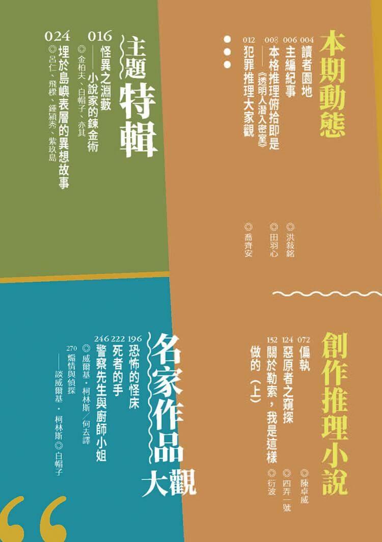 以「怪異」、「異想」為主題,刊載陳卓威、四弄一號、衍波等三篇原創短篇小說,以及以「埋於島嶼表層的異想故事」為題的主題創作專欄,收錄呂仁、飛樑、鍾潁秀、紫玖島等四篇極短篇小說。本期作家專訪為天后級作家尾巴(MISA),並收錄五家精采書評。