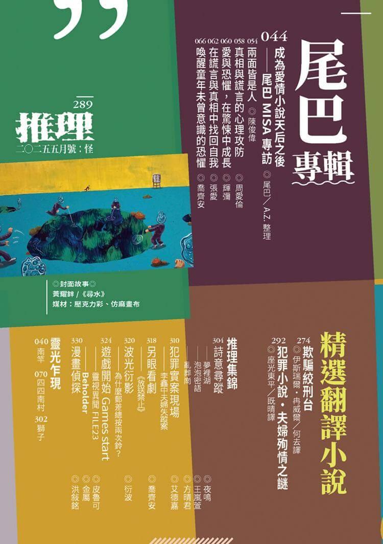 尾巴是期許自己能成為左手寫鬼故事,右手寫愛情的作者,創作風格多變,且出版書目眾多,已然是當今臺灣「天后級」的人物,但在她的內心中,對於自己創作歷程的回顧是什麼?對於讀者評價,又有哪些想法?可從這篇專訪中略知一二。同時,推理雜誌首次重金禮聘五位評論家,針對五本作品進行專業的導讀與評介。