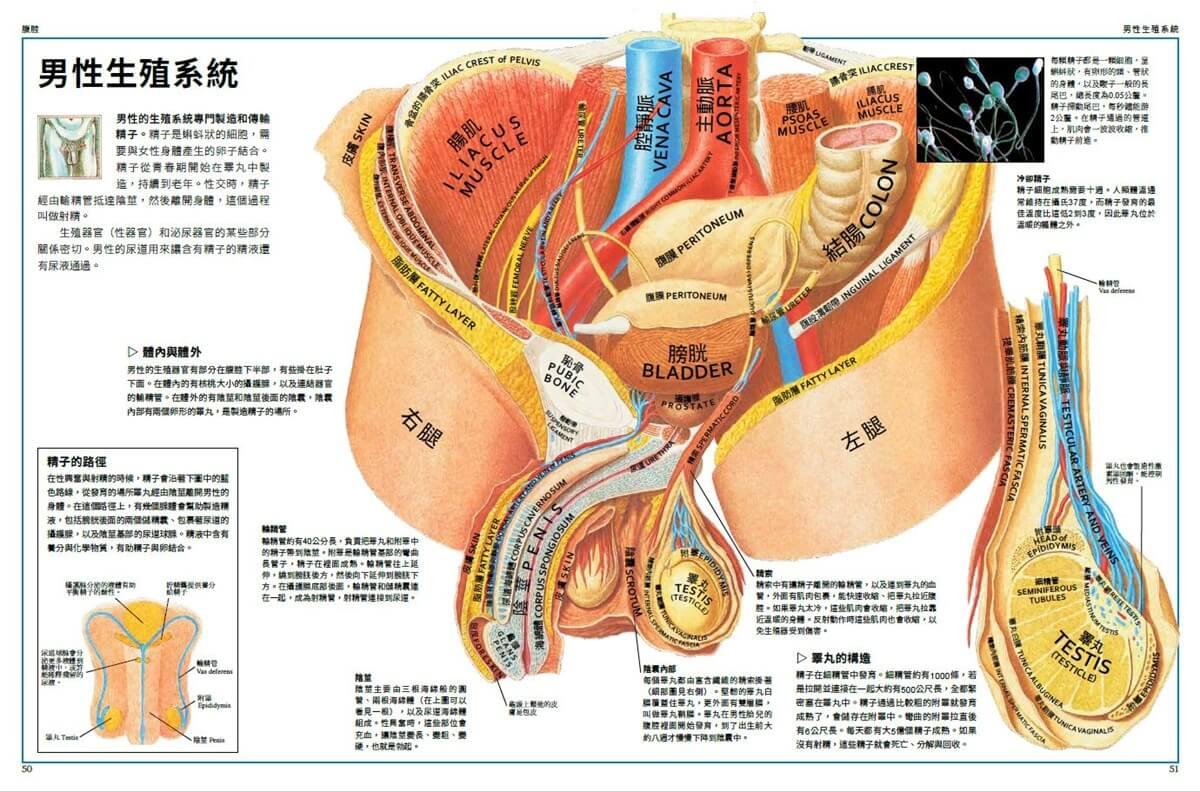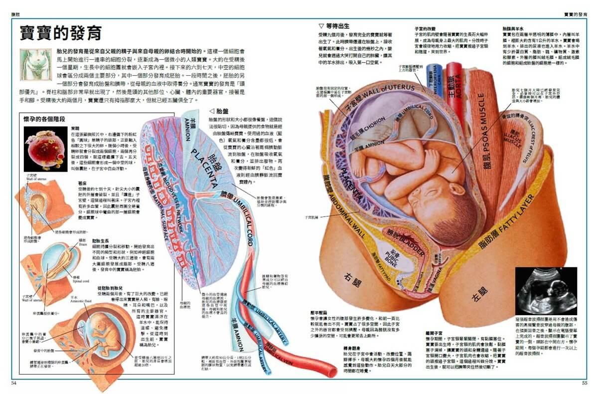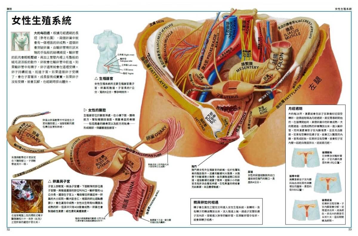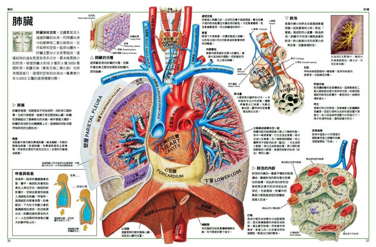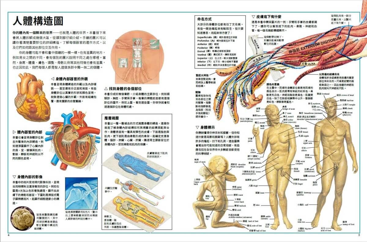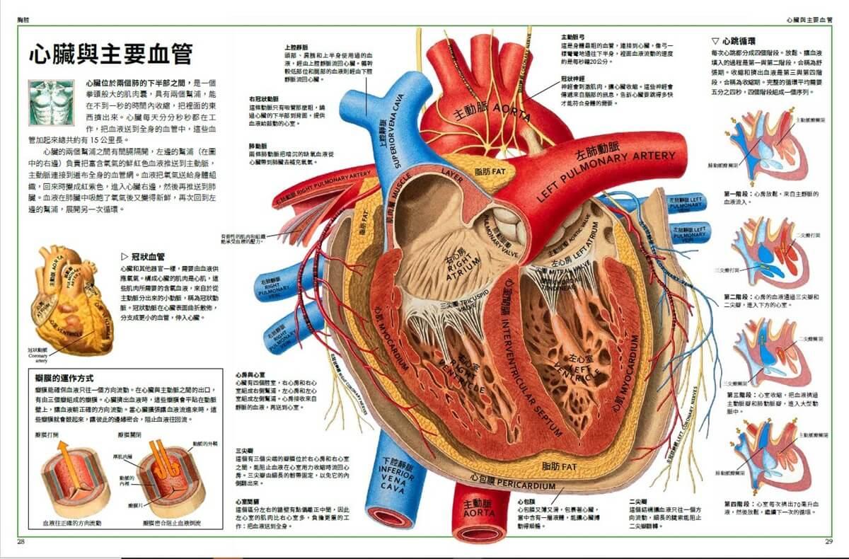接下來這兩個跨頁介紹的是身體的主要系統。某些系統的各個器官都聚集在一處,例如消化系統中絕大部分的器官都位於腹腔內。而某些系統的器官則分散在身體各處,例如循環系統中的血管。