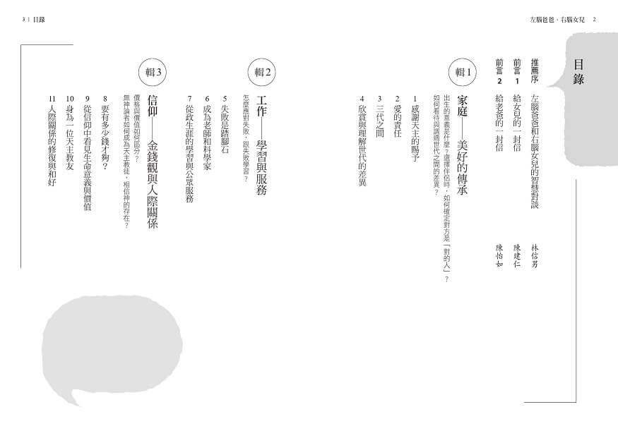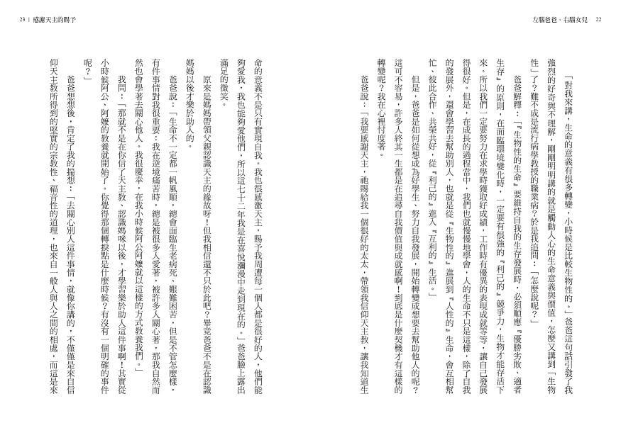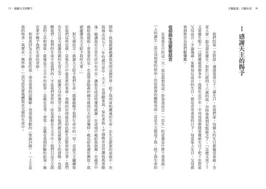 這些父女談心的內容,有關於父親原生家庭傳承的美好價值,有戀愛、結婚、為人父母的心路歷程分享;有工作與服務的學習與反思,也有關於信仰、金錢觀與人際關係的討論;從生命與受苦的意義,到看待死亡與死後世界,也探討當前的幾個重大議題,以及關於環境與自然的討論。