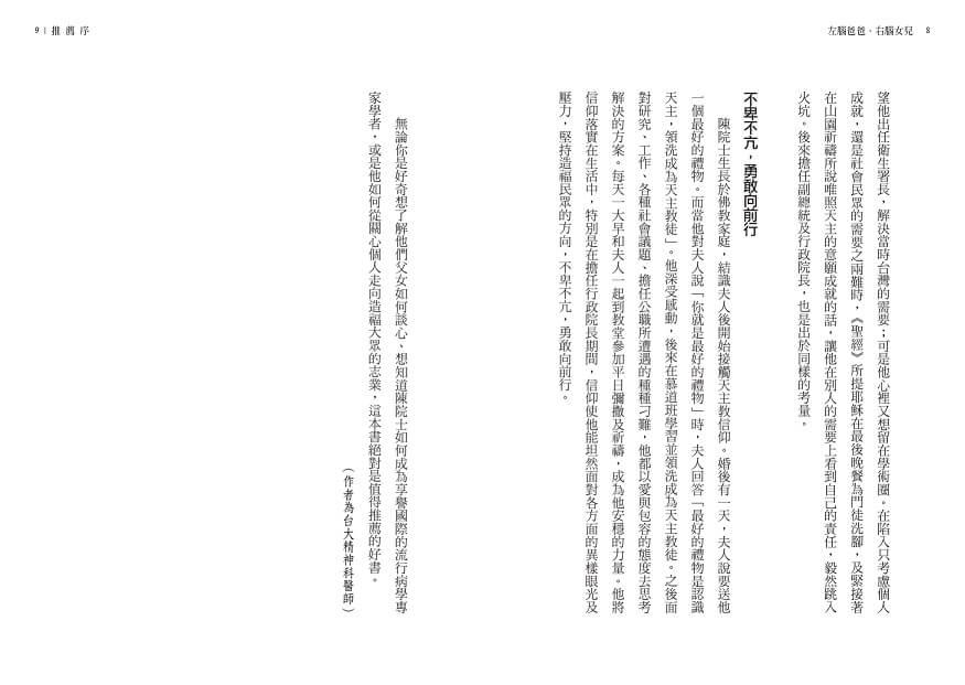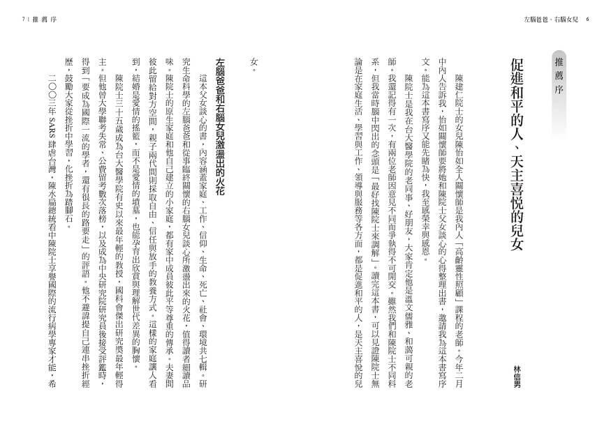 同在中研院服務,我常見到陳建仁院士,他總以專業、誠摯態度應對每件事情,令人敬重。閱讀此本父女間的「對話錄」,書中坦率且深入的對談,讓我更加理解陳院士在公私領域所展現的深厚智慧、謙遜與關懷,也得以窺見他身為父親、丈夫與公僕的多重面貌。