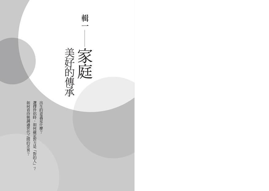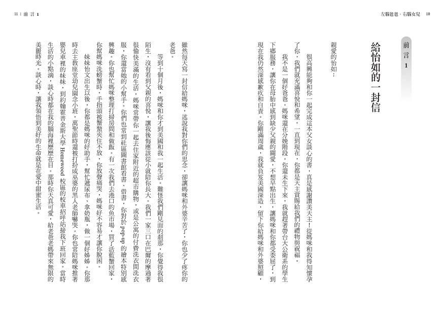 怡如讀大學時,每個週末爸爸開車載她回宿舍的路上,父女倆總是天南地北的聊天談心,爸爸經常以男性的視角給她一些新眼光來看待事物。自從結婚後,這樣的時光很難再有。為了彌補缺憾,於是他們展開了這個對談共筆的計畫......