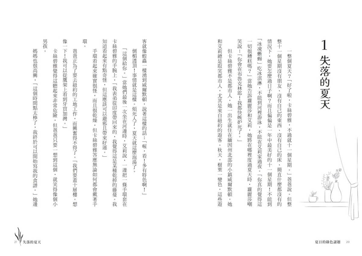 女孩夏日的綠色冒險帶來一連串驚喜與感動。她對植物、友情與成長的探索印記都留駐在這個甜蜜漫長的夏天。這本書適合送給每一個人,閱讀這部作品的滋味,就像一面啜飲沁涼的薄荷茶,一面攪拌杯裡的冰塊,心情美好清新。──知名譯者.閱讀推廣人 黃筱茵