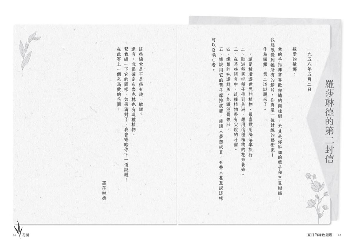在滿是花朵壁紙和繡花靠墊的喧囂公寓裡,卡絲碧雅無意間在繪著花卉的抽屜櫃深處,發現一捆寄自六十年前的淡綠色信件,內容都是位名叫羅莎琳德的失明女孩,從世界各地寫給姊姊敏娜的植物謎題。