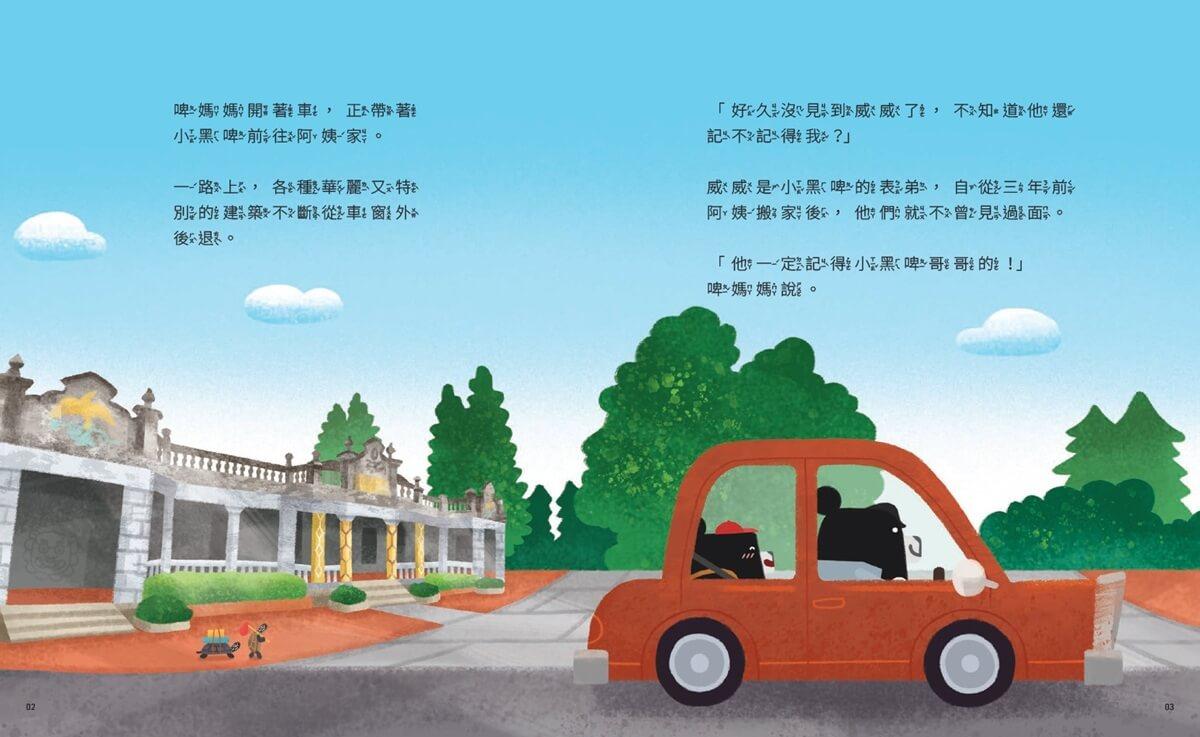 啤媽媽開著車,正帶著小黑啤前往阿姨家。一路上,各種華麗又特別的建築不斷從車窗外後退。