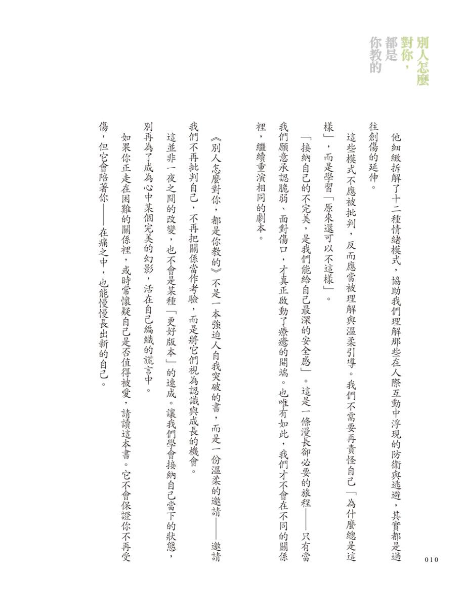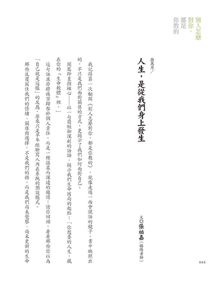 ● 張祐嘉(楊陽老師)推薦:「《別人怎麼對你,都是你教的》不是一本強迫人自我突破的書,而是一份溫柔的邀請──邀請我們不再批判自己,不再把關係當作考驗,而是將它們視為認識與成長的機會。如果你正走在困難的關係裡,或時常懷疑自己是否值得被愛,請讀這本書。它不會保證你不再受傷,但它會陪著你──在痛之中,也能慢慢長出新的自己。」──摘自推薦序
