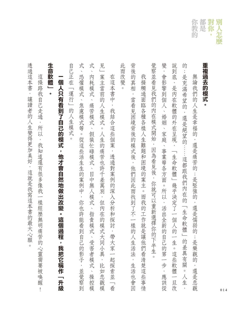 無論我們的人生是幸福的,還是痛苦的;是堅強的,還是懦弱的;是樂觀的,還是悲觀的;是充滿希望的,還是絕望的……這都跟我們內在的「生命軟體」的差異有關。人生,說到底,是內在軟體的外在呈現,「生命軟體」幾乎決定了一個人的一生。這些軟體一旦改變,會影響到個人、婚姻、家庭、事業等各方面。所以,活出全新的自己的第一步,應該從覺察並看見我們的內在模式開始,因為看見後,你就可以重新選擇你的下半生。