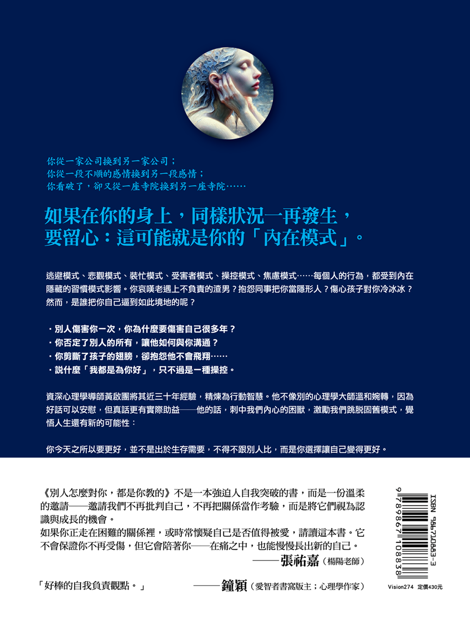 ●逃避模式、悲觀模式、裝忙模式、受害者模式、操控模式、焦慮模式……每個人的行為,都受到內在隱藏的習慣模式影響。你哀嘆老遇上不負責的渣男?抱怨同事把你當隱形人?傷心孩子對你冷冰冰?然而,是誰把你自己逼到如此境地的呢?