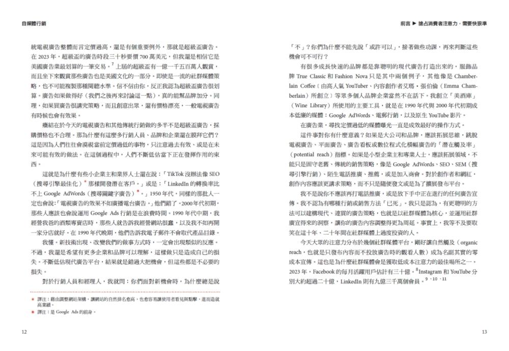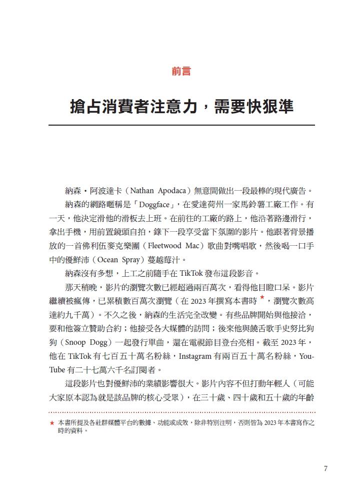 本書要談的不只是社群媒體,而是如何在價值被低估的注意力管道中精通說故事的藝術和科學。當然,社群媒體恰巧在其中占有很大的區塊,不過你會在閱讀本書的過程中看到,它還涉及像是活動行銷、收藏品的開發、在串流服務投放廣告、品牌聯名、網紅合作等「策略」,甚至有時候可能還包括傳統的廣告宣傳,像是電視廣告或看板。