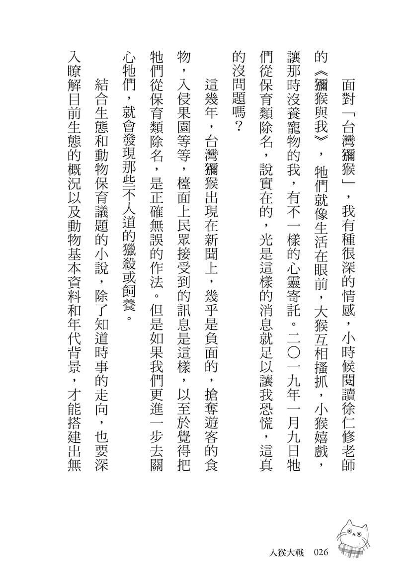 希望這本《人猴大戰》可以讓更多人可以思考人與野生動物間的關係,這場戰爭的停止終究只能從人類開始。