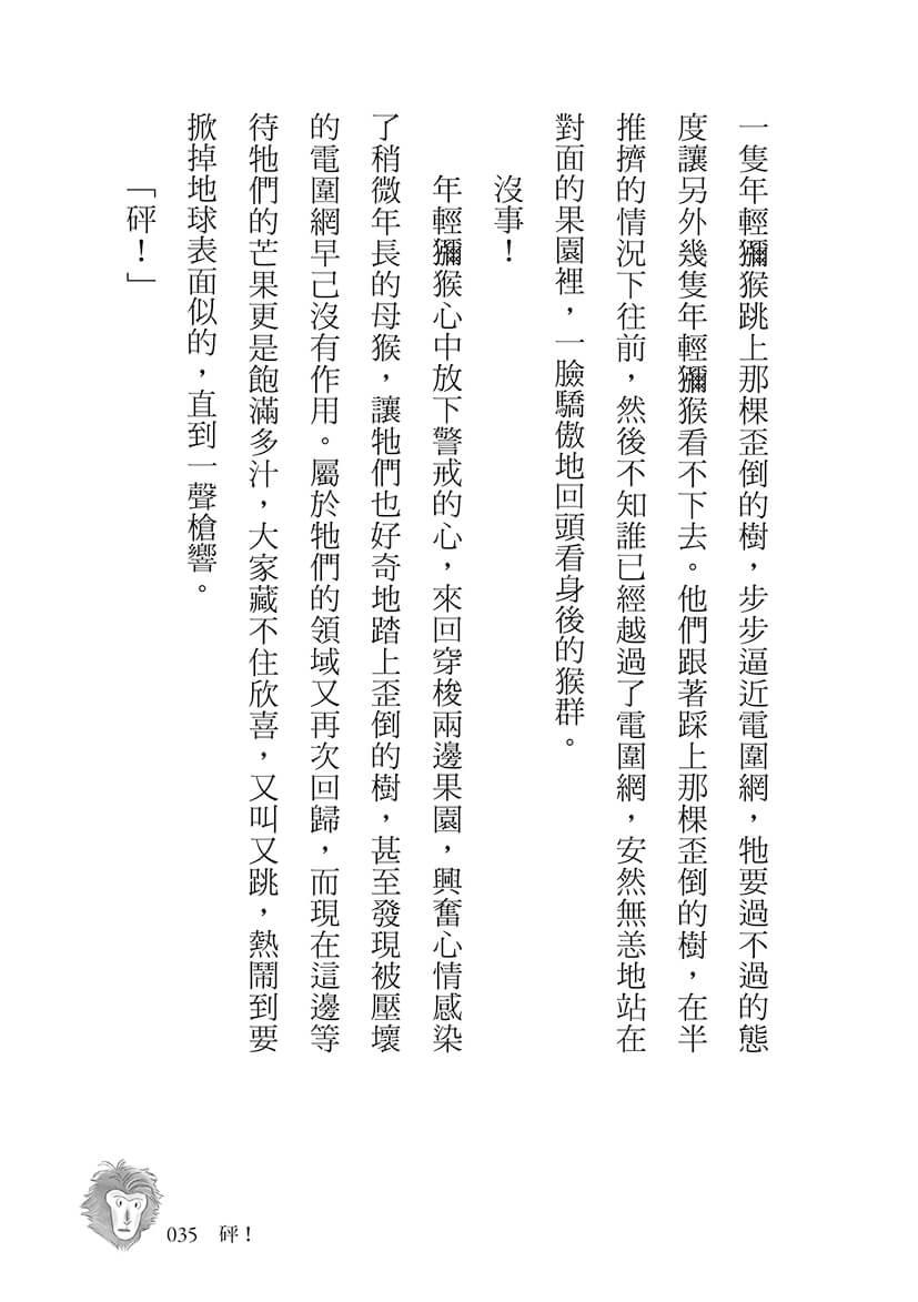 要以台灣獼猴為主角,對於生態保育類的小說而言,是件吃力不討好的事,因為牠不是瀕危或稀有珍貴的動物就算了,牠簡直是令人頭痛的搗蛋鬼。這個架構要顧及很多層面,不能一味地保護牠們,而忽略備獼猴受騷擾的果農,當環境失控時,每個生存者都是受害者,都應該受到重視才對。
