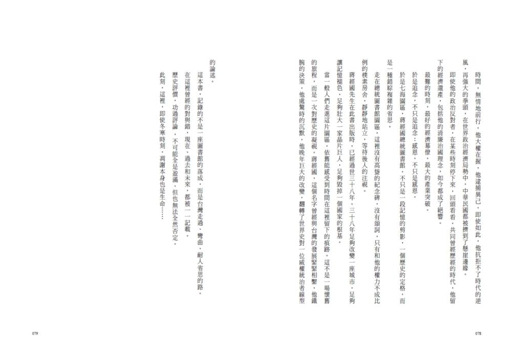 歷史學者黃克武下的注腳:「歷史,不能就這麼被抹去,有些人,有些事,不該就這麼被遺忘。我們所做的,不是留下兩蔣,而是留下台灣曾經走過的路。」這段路,有悲傷有歡笑,有艱難還有遠超過想像的「奇蹟」;這段路,屬於在台灣的每一個人。