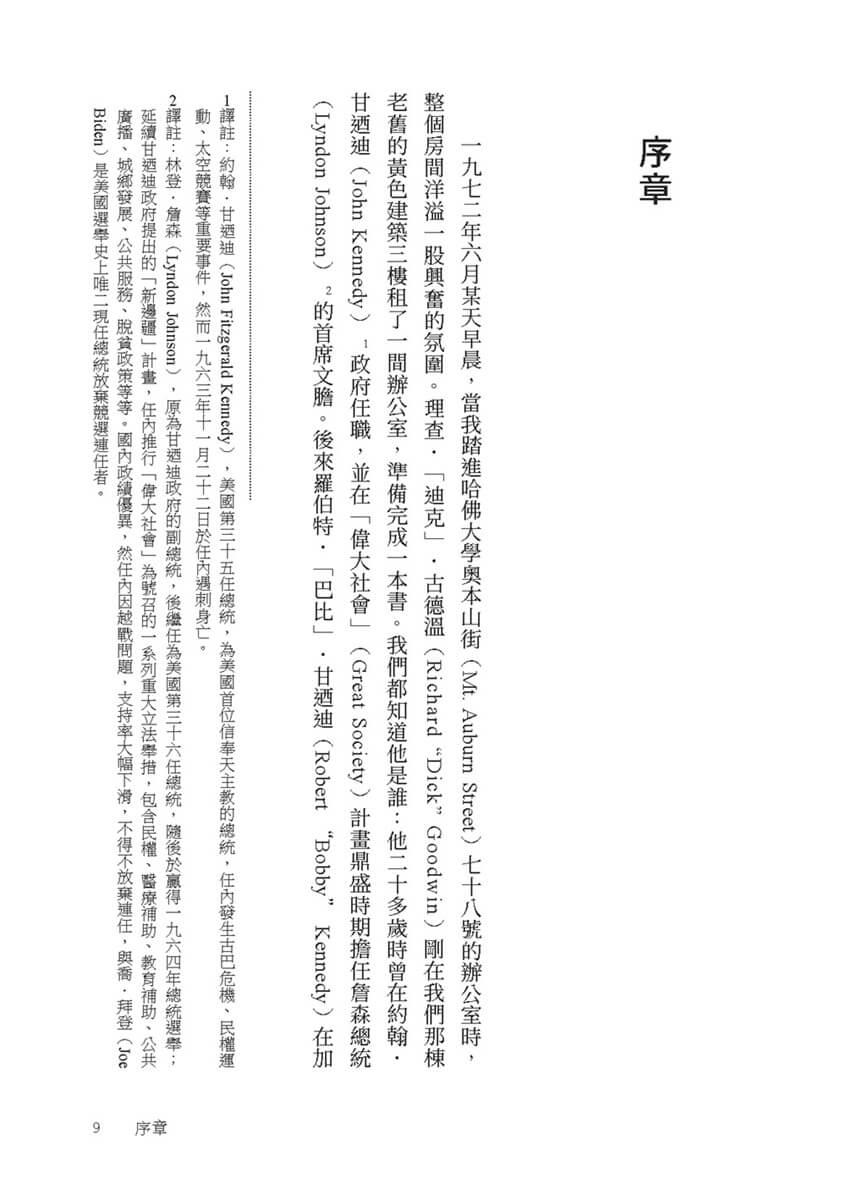 一九七二年六月某天早晨,當我踏進哈佛大學奧本山街(Mt. Auburn Street)七十八號的辦公室時,整個房間洋溢一股興奮的氛圍。理查.「迪克」.古德溫(Richard “Dick” Goodwin)剛在我們那棟老舊的黃色建築三樓租了一間辦公室,準備完成一本書。我們都知道他是誰:他二十多歲時曾在約翰.甘迺迪(John Kennedy) 政府任職,並在「偉大社會」(Great Society)計畫鼎盛時期擔任詹森總統(Lyndon Johnson) 的首席文膽。後來羅伯特.「巴比」.甘迺迪(Robert “Bobby” Kennedy)在加州遇害身亡時,他也在場。一位認識他的人說,他是其見過最聰明、最有趣的人,但有時也顯得輕率、善變且傲慢─總之,他是一名耀眼且難以捉摸的人物。