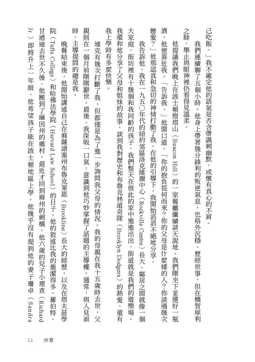 我告訴他,我在一九五○年代的紐約郊區洛克維爾中心(Rockville Centre)長大。鄰居之間就像一個大家庭,街坊裡有十幾個和我同齡的孩子,我們整天在彼此的家中進進出出,街道就是我們的遊樂場。我還和他分享了父母和姐妹的故事,談到我對歷史和布魯克林道奇隊(Brooklyn Dodgers)的熱愛,還有我上學時有多麼快樂。