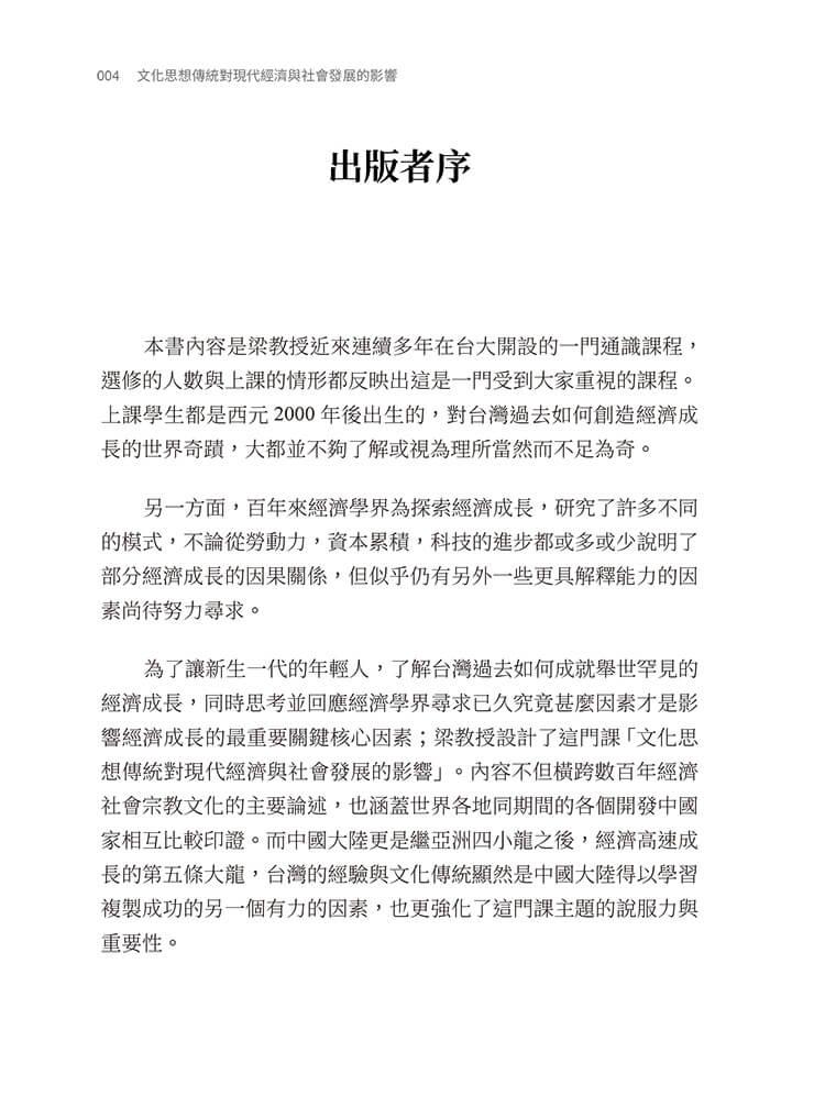 本書內容是梁教授近來連續多年在台大開設的一門通識課程,選修的人數與上課的情形都反映出這是一門受到大家重視的課程。上課學生都是西元2000年後出生的,對台灣過去如何創造經濟成長的世界奇蹟,大都並不夠了解或視為理所當然而不足為奇。