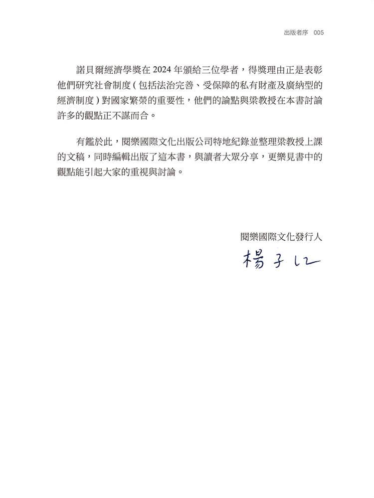 諾貝爾經濟學獎在2024年頒給三位學者,得獎理由正是表彰他們研究社會制度(包括法治完善、受保障的私有財產及廣納型的經濟制度)對國家繁榮的重要性,他們的論點與梁教授在本書討論許多的觀點正不謀而合。